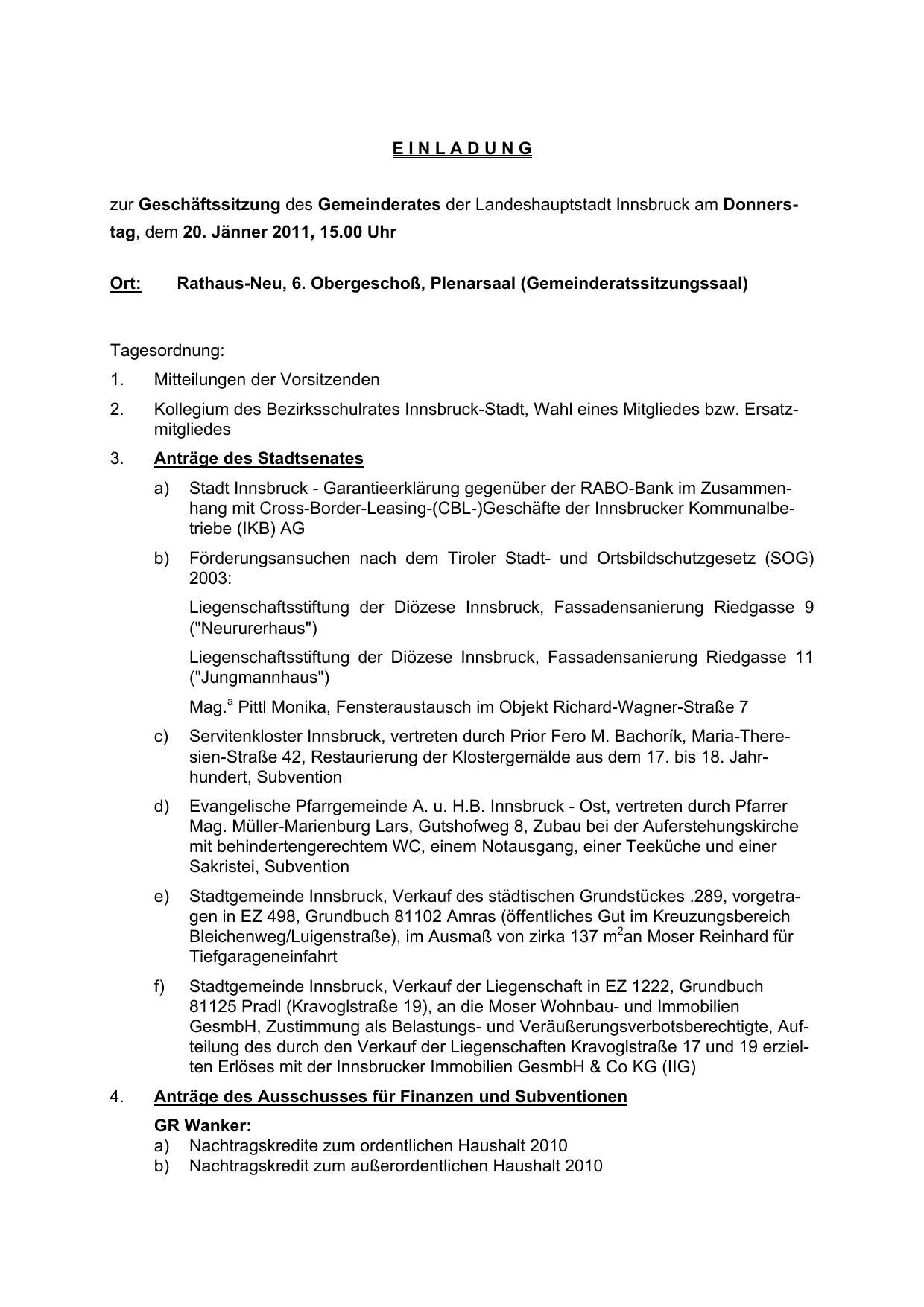 zur Geschäftssitzung des Gemeinderates der Landeshauptstadt Innsbruck am Donnerstag, dem 20. Jänner 2011, 15.00 Uhr