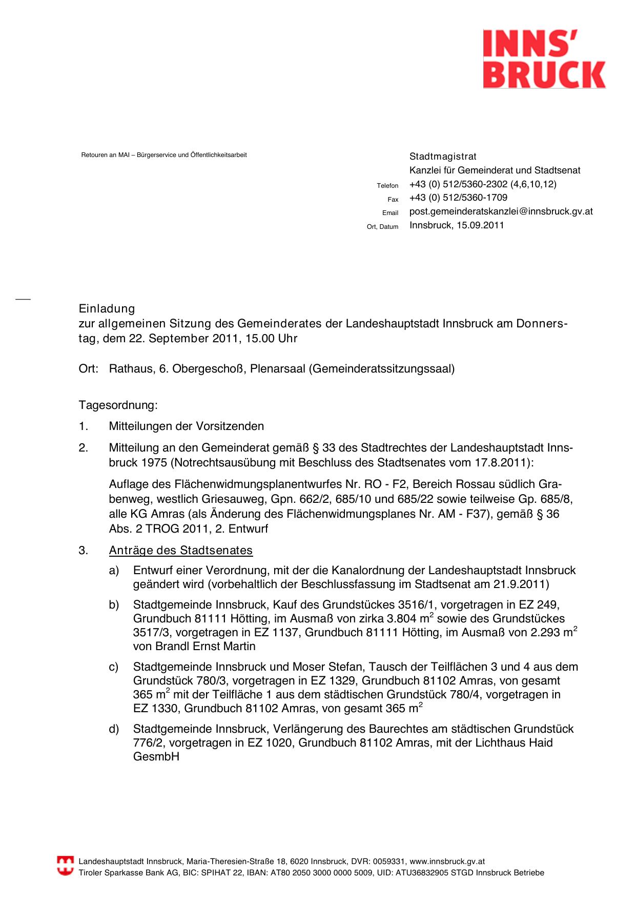 zur allgemeinen Sitzung des Gemeinderates der Landeshauptstadt Innsbruck am Donnerstag, dem 22. September 2011, 15.00 Uhr