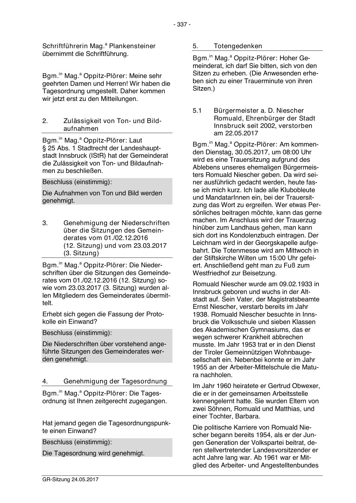 Ablebens unseres ehemaligen Bürgermeisters Romuald Niescher geben. Da wird seiner ausführlich gedacht werden, heute fasse ich mich kurz. Ich lade alle Klubobleute