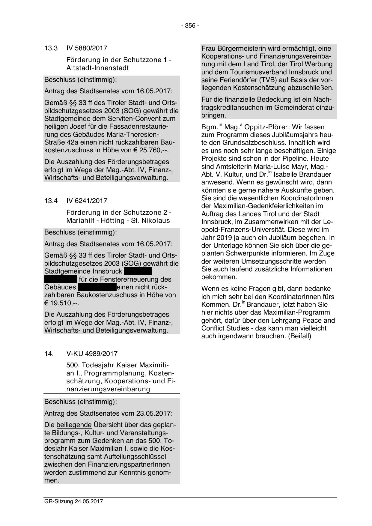 Die beiliegende Übersicht über das geplante Bildungs-, Kultur- und Veranstaltungsprogramm zum Gedenken an das 500. Todesjahr Kaiser Maximilian I. sowie die Kostenschätzung samt Aufteilungsschlüssel