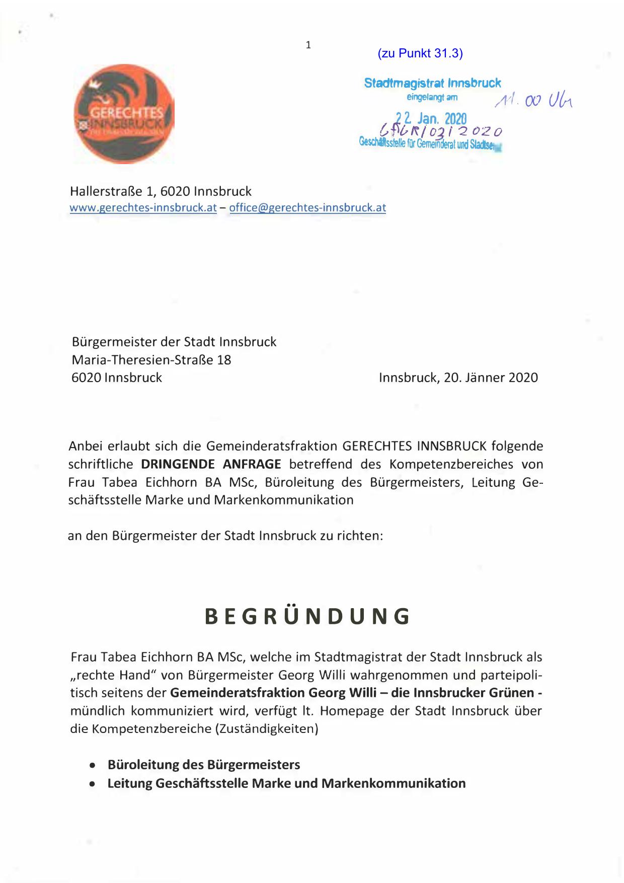 Anbei erlaubt sich die Gemeinderatsfraktion GERECHTES INNSBRUCK folgende