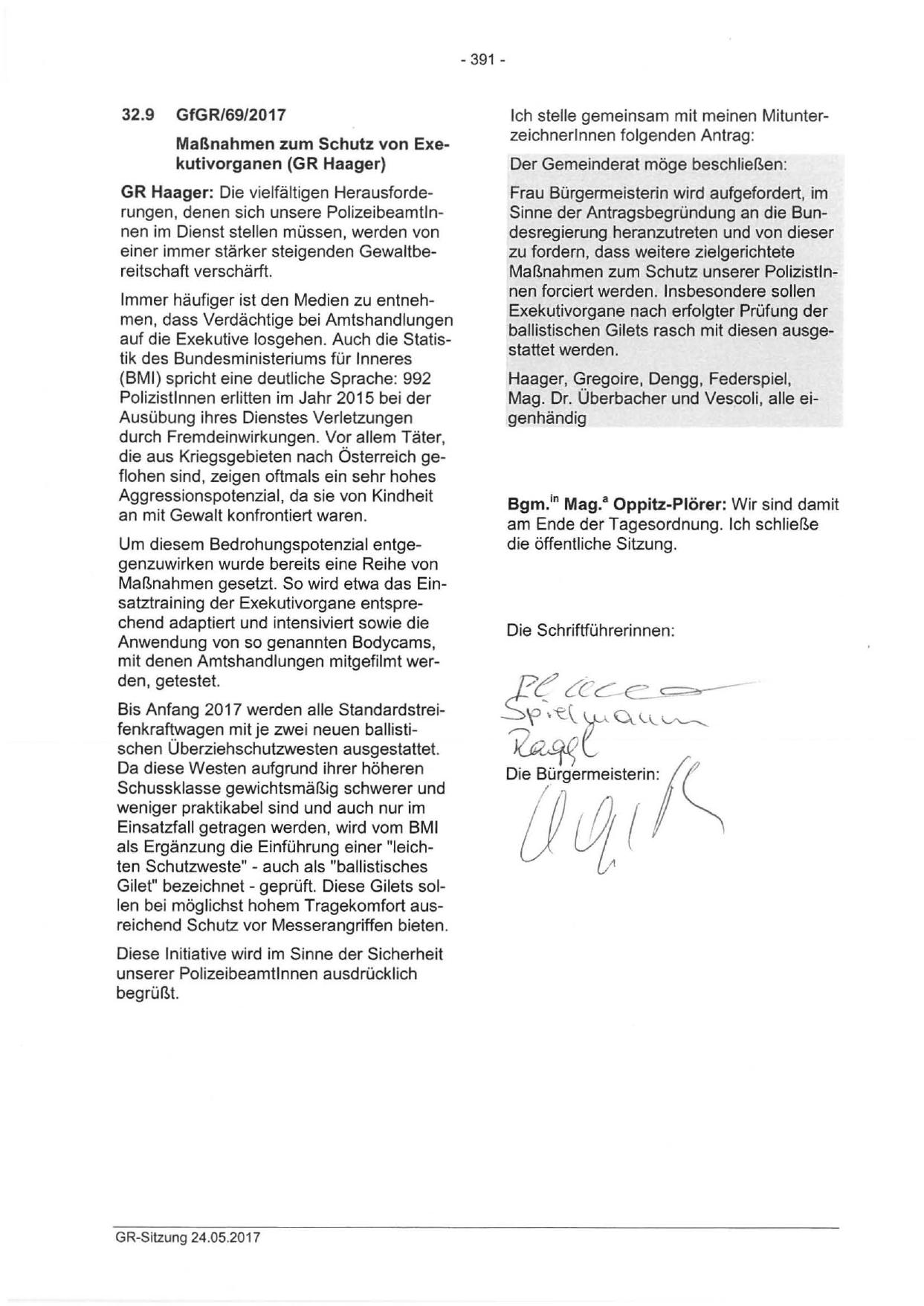 Maßnahmen zum Schutz von Exekutivorganen (GR Haager)