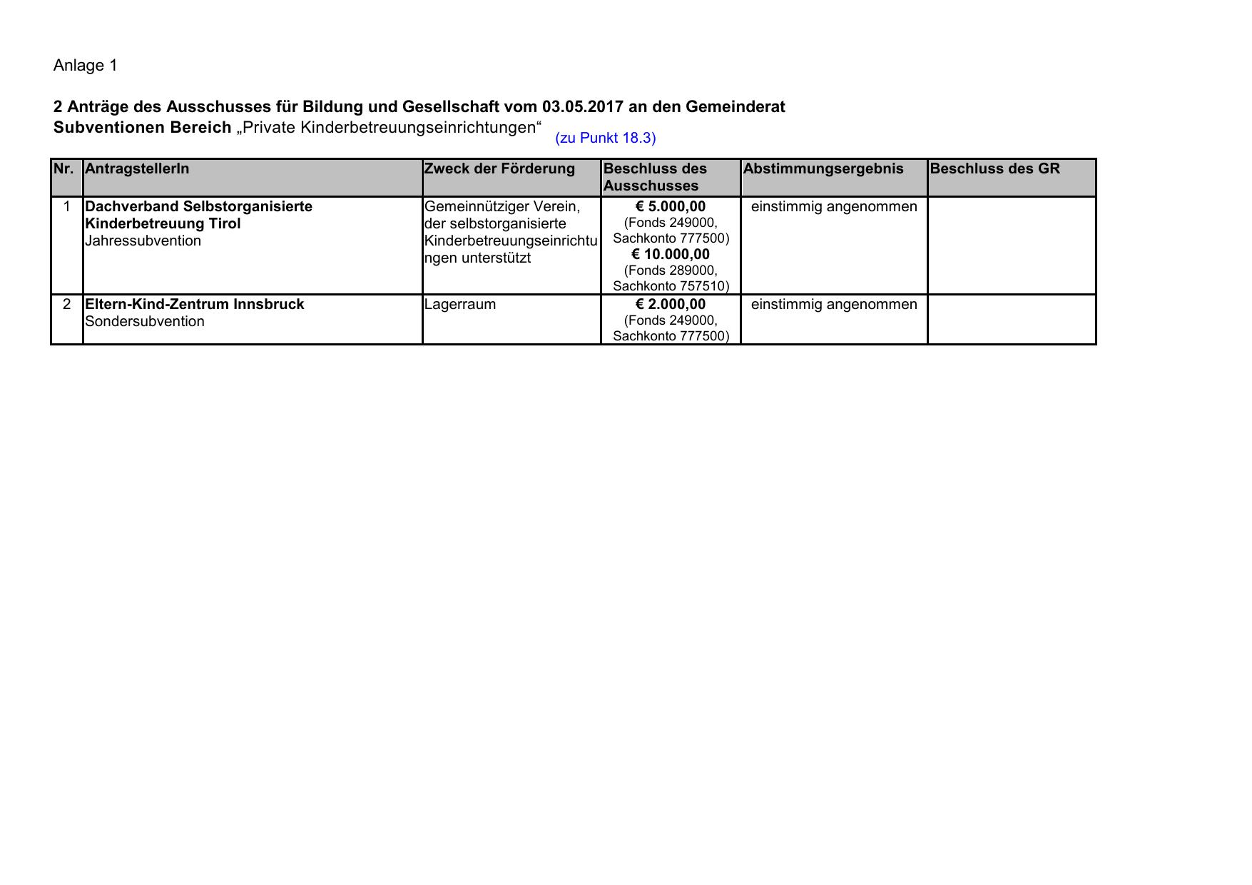 2 Anträge des Ausschusses für Bildung und Gesellschaft vom 03.05.2017 an den Gemeinderat