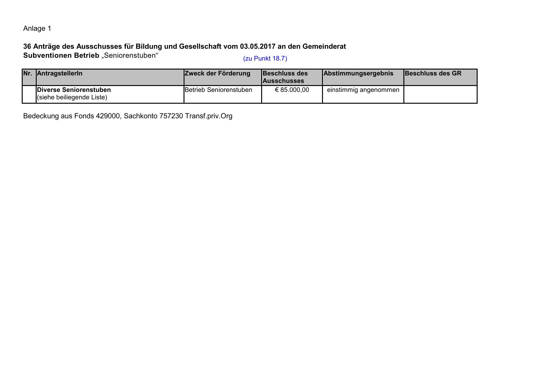 36 Anträge des Ausschusses für Bildung und Gesellschaft vom 03.05.2017 an den Gemeinderat