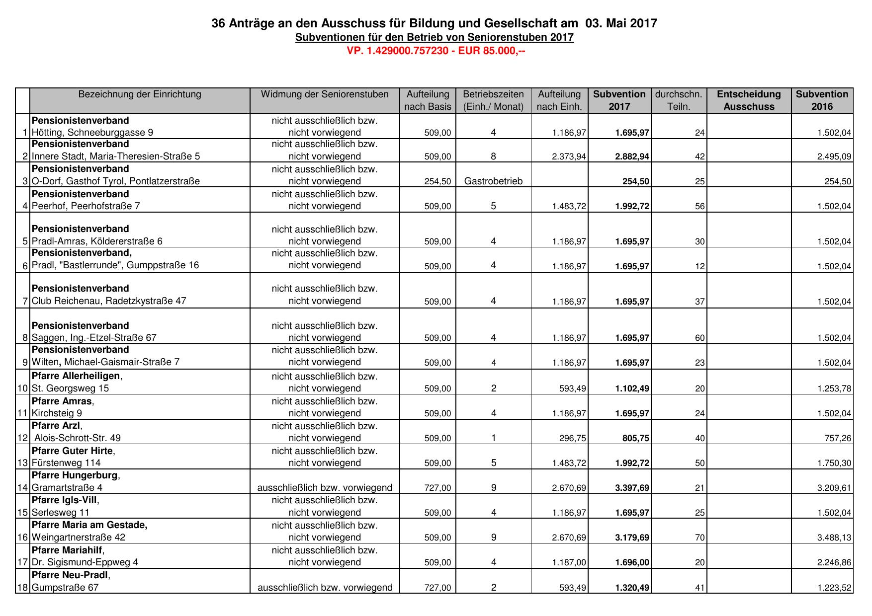 Subventionen für den Betrieb von Seniorenstuben 2017