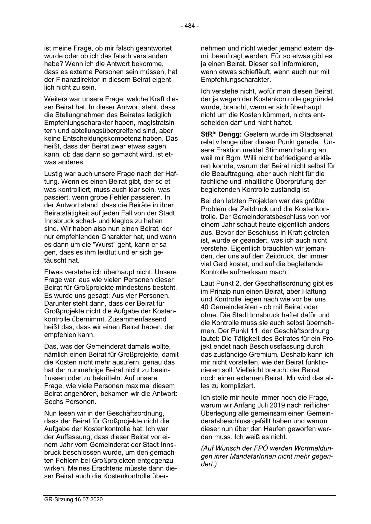 der Auffassung, dass dieser Beirat vor einem Jahr vom Gemeinderat der Stadt Innsbruck beschlossen wurde, um den gemachten Fehlern bei Großprojekten entgegenzuwirken. Meines Erachtens müsste dann dieser Beirat auch die Kostenkontrolle überGR-Sitzung 16.07.2020