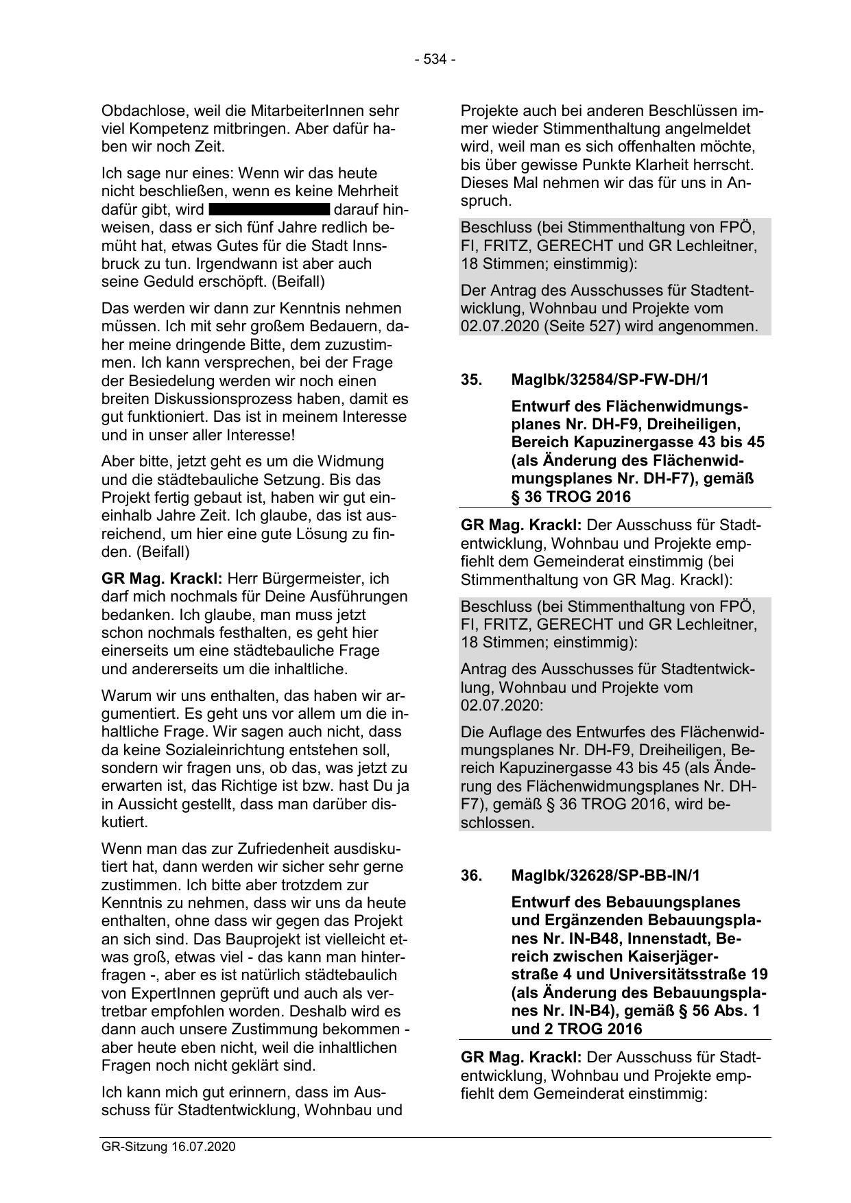 Die Auflage des Entwurfes des Flächenwidmungsplanes Nr. DH-F9, Dreiheiligen, Bereich Kapuzinergasse 43 bis 45 (als Änderung des Flächenwidmungsplanes Nr. DHF7), gemäß § 36 TROG 2016, wird beschlossen.