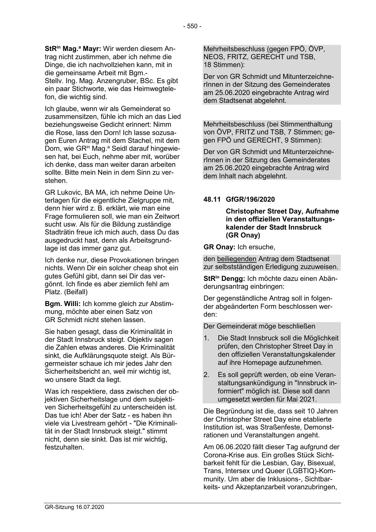 von ÖVP, FRITZ und TSB, 7 Stimmen; gegen FPÖ und GERECHT, 9 Stimmen):