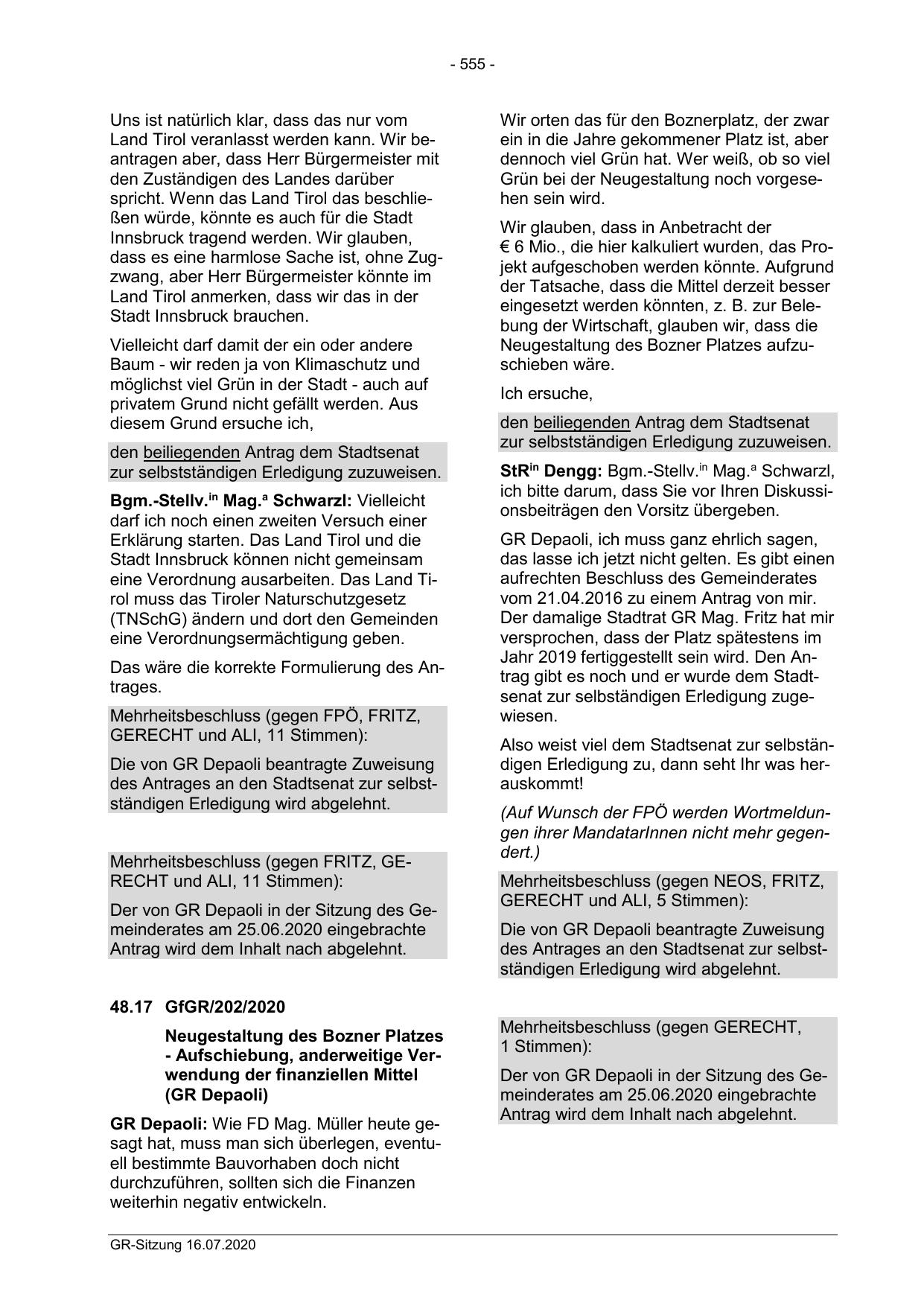 Der von GR Depaoli in der Sitzung des Gemeinderates am 25.06.2020 eingebrachte
