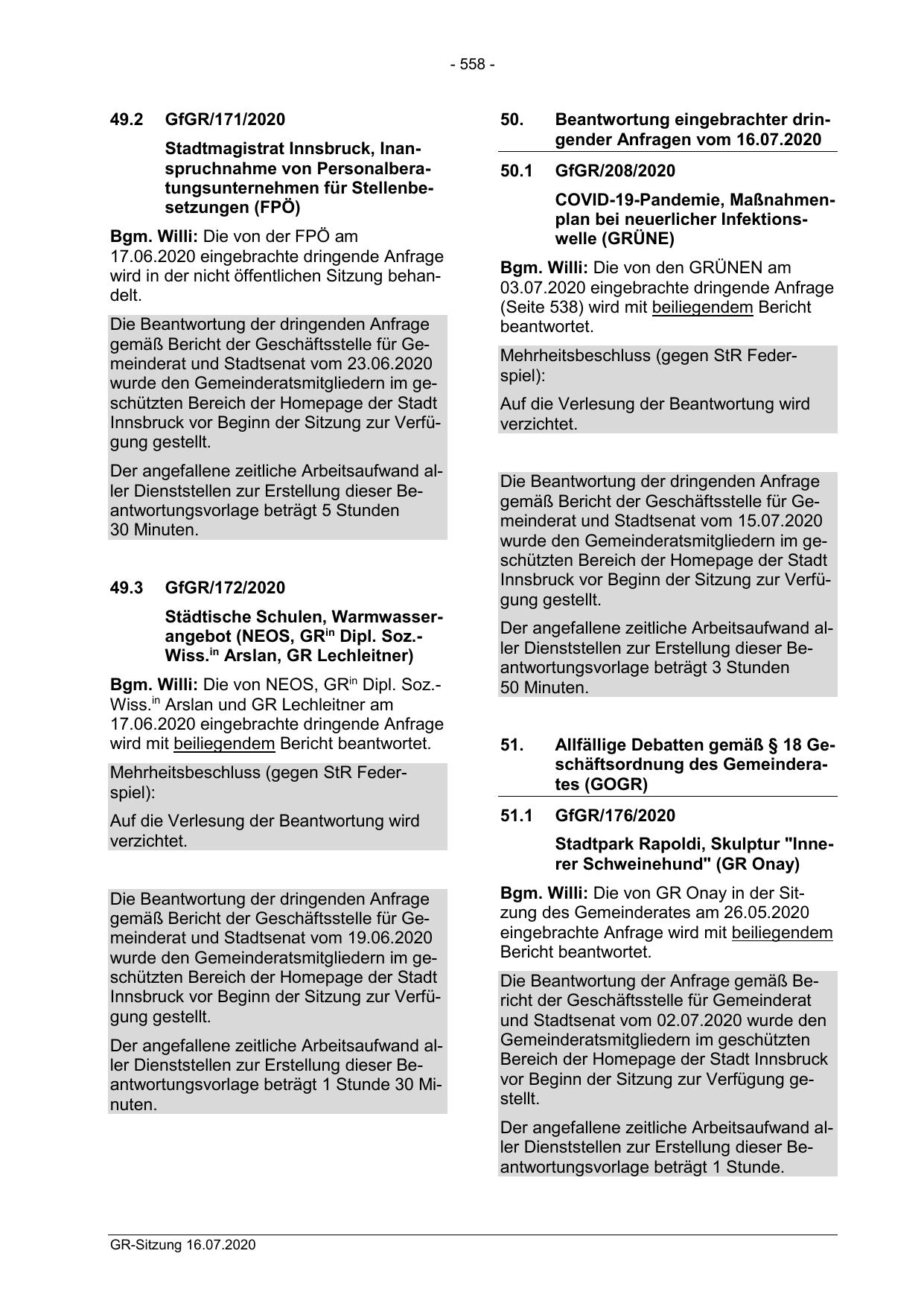 Beantwortung eingebrachter dringender Anfragen vom 16.07.2020