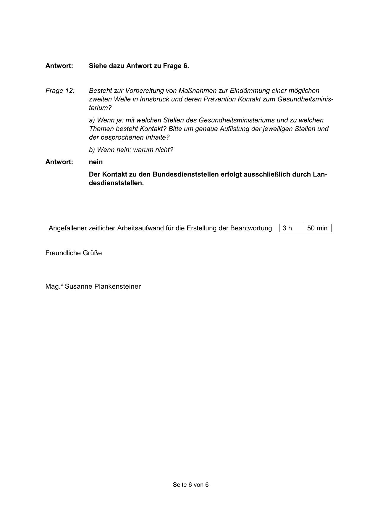 zweiten Welle in Innsbruck und deren Prävention Kontakt zum Gesundheitsministerium?