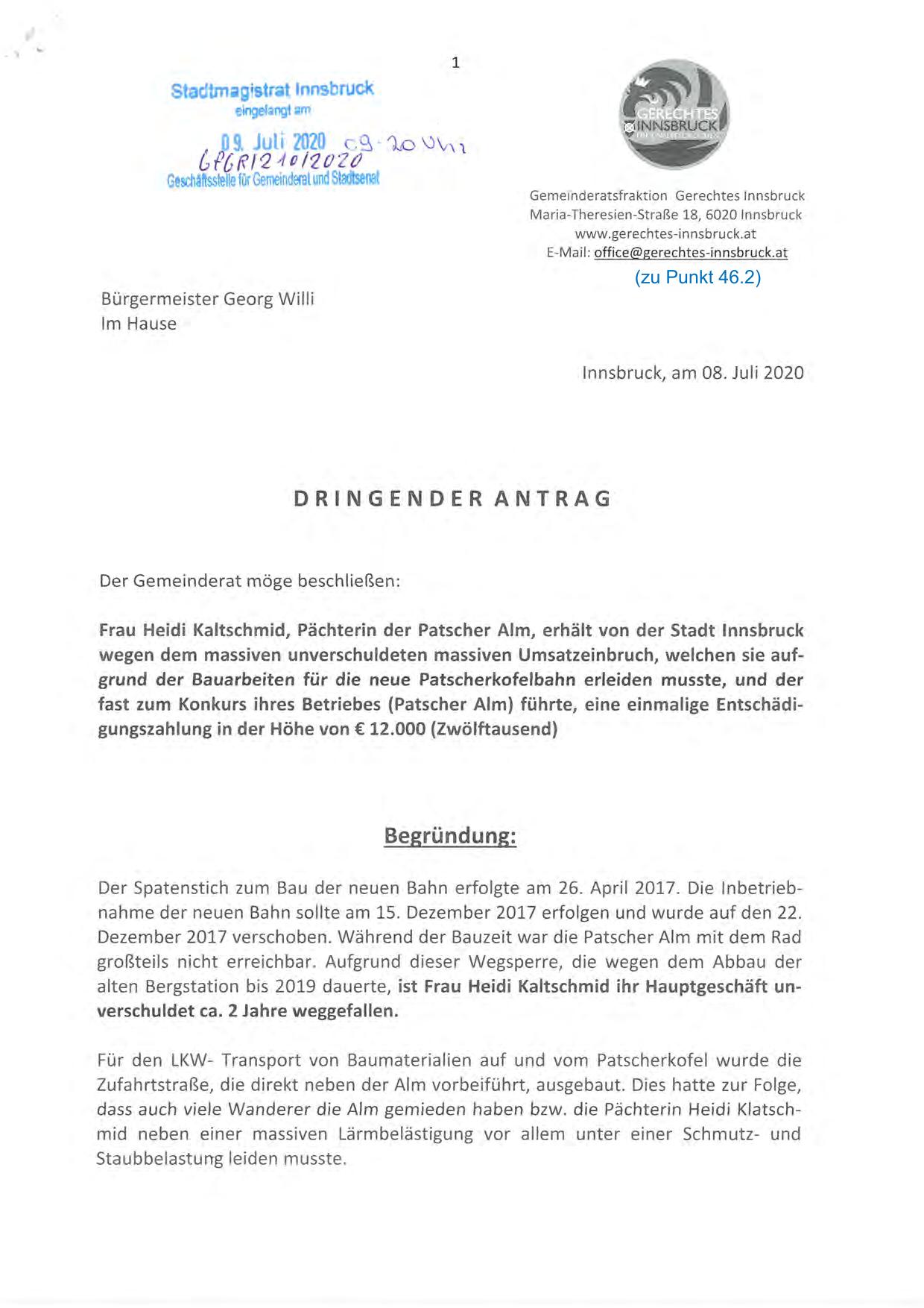 fast zum Konkurs ihres Betriebes ( Patscher Alm) führte, eine einmalige Entschädigungszahlung in der Höhe von 12.000 ( Zwölftausend )