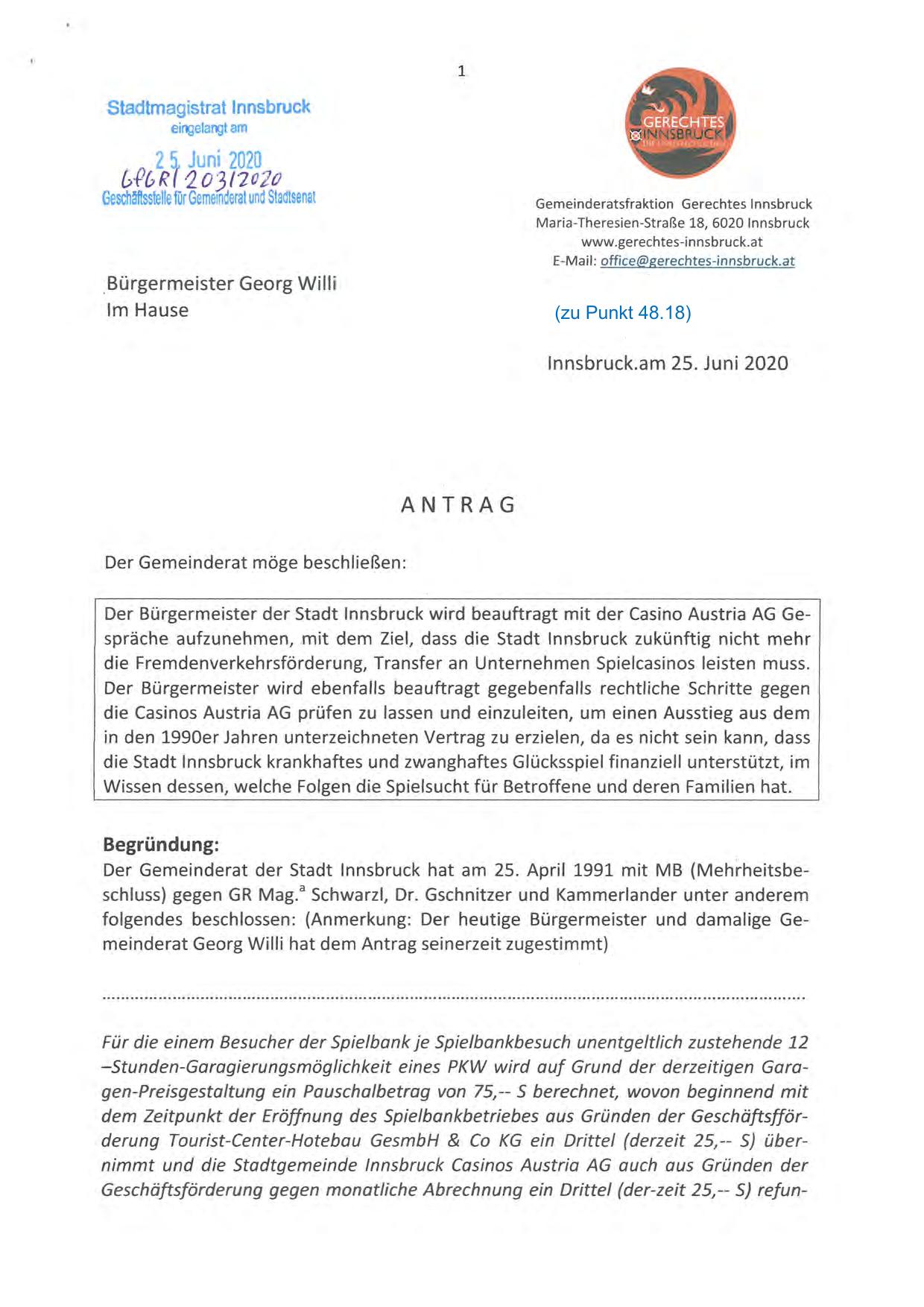 Der Bürgermeister der Stadt Innsbruck wird beauftragt mit der Casino Austria AG Gespr ä che aufzunehmen, mit dem Ziel, dass die Stadt Innsbruck zuk ünftig nicht mehr