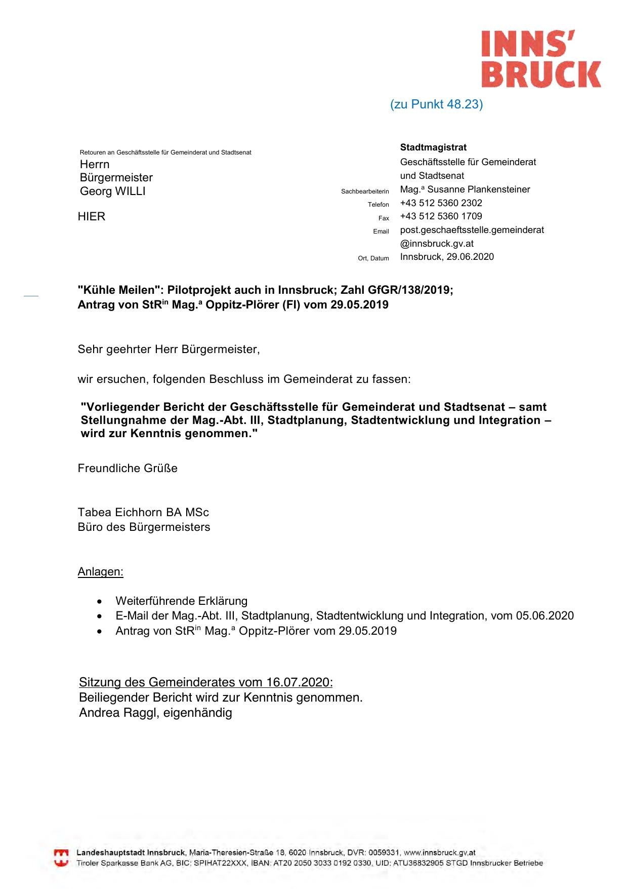 "Kühle Meilen": Pilotprojekt auch in Innsbruck; Zahl GfGR/138/2019;
