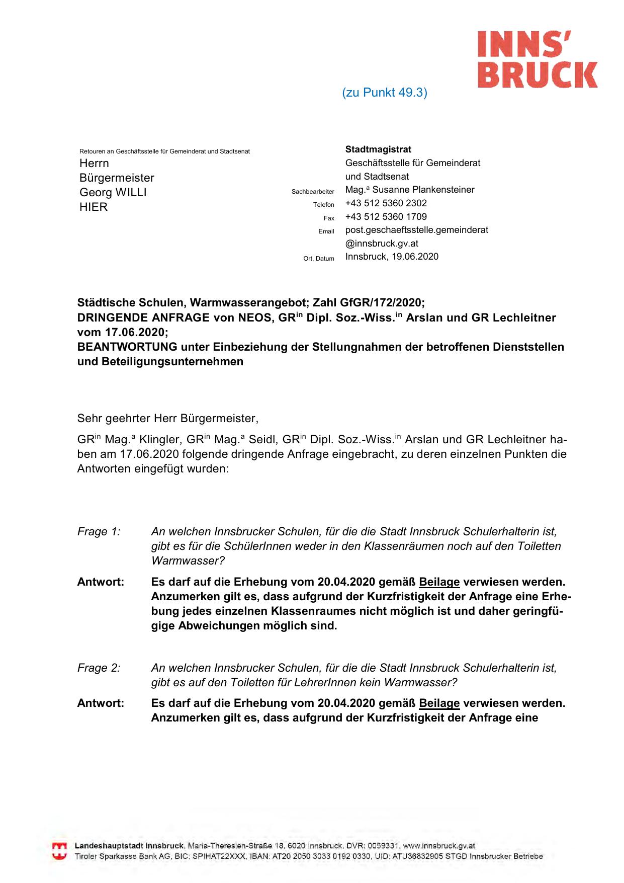 GRin Mag.a Klingler, GRin Mag.a Seidl, GRin Dipl. Soz.-Wiss.in Arslan und GR Lechleitner haben am 17.06.2020 folgende dringende Anfrage eingebracht, zu deren einzelnen Punkten die