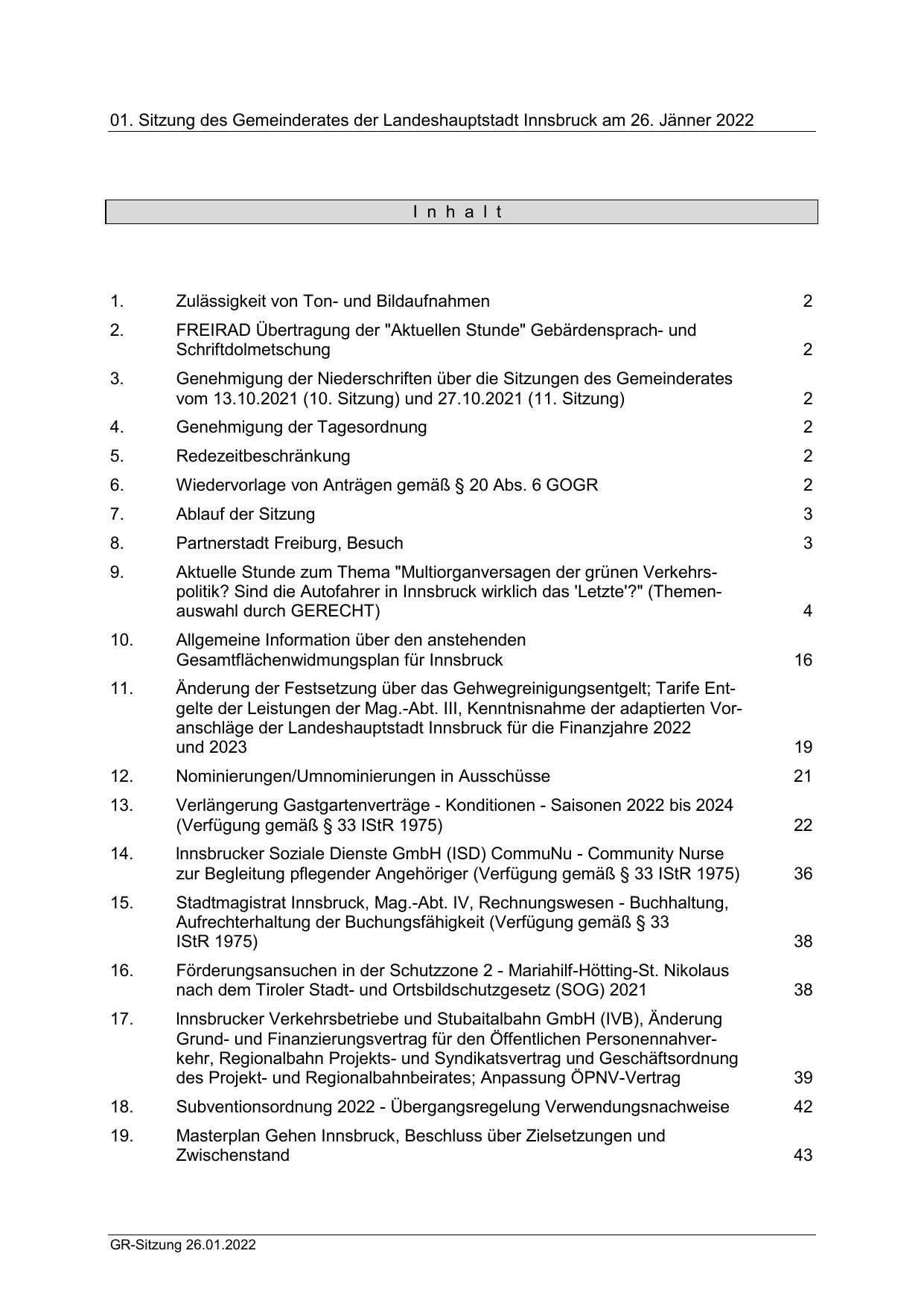 01. Sitzung des Gemeinderates der Landeshauptstadt Innsbruck am 26. Jänner 2022
