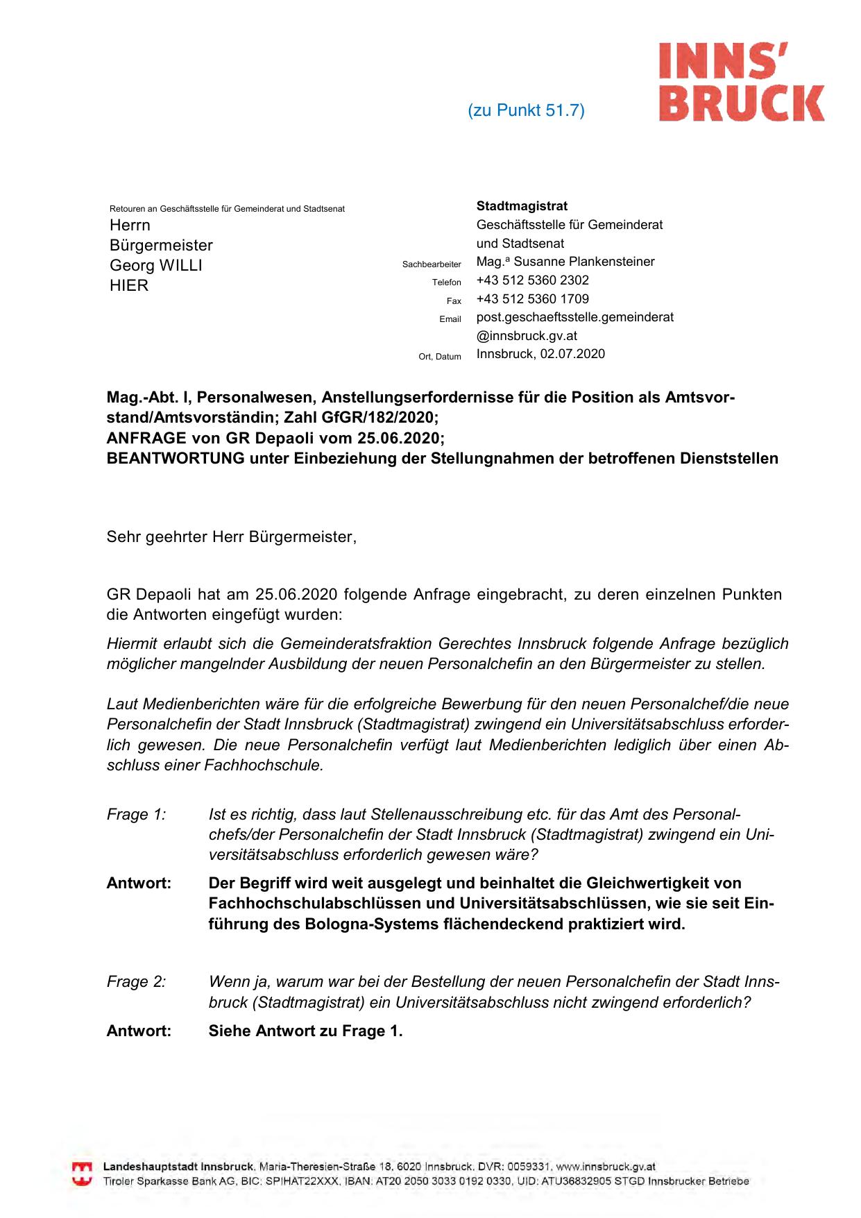 Personalchefin der Stadt Innsbruck (Stadtmagistrat) zwingend ein Universitätsabschluss erforderlich gewesen. Die neue Personalchefin verfügt laut Medienberichten lediglich über einen Abschluss einer Fachhochschule.