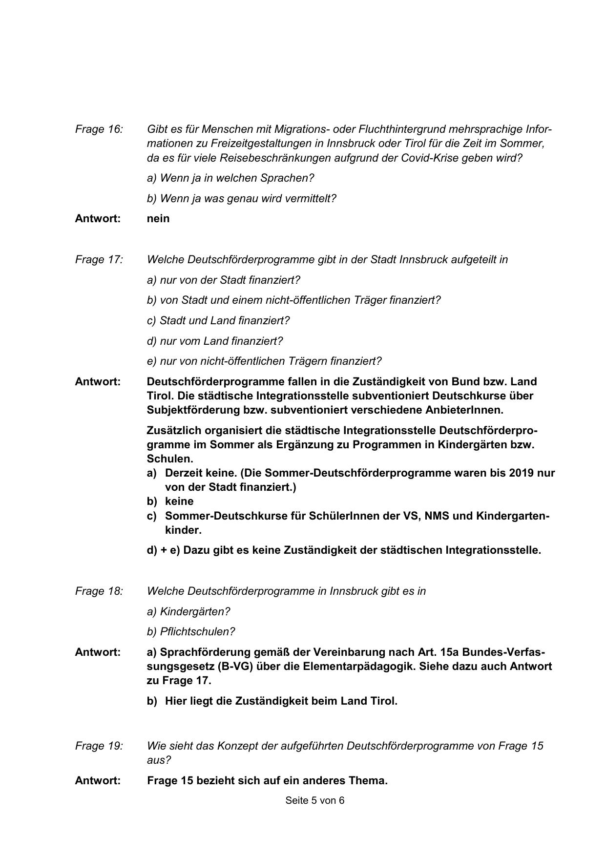 Welche Deutschförderprogramme gibt in der Stadt Innsbruck aufgeteilt in