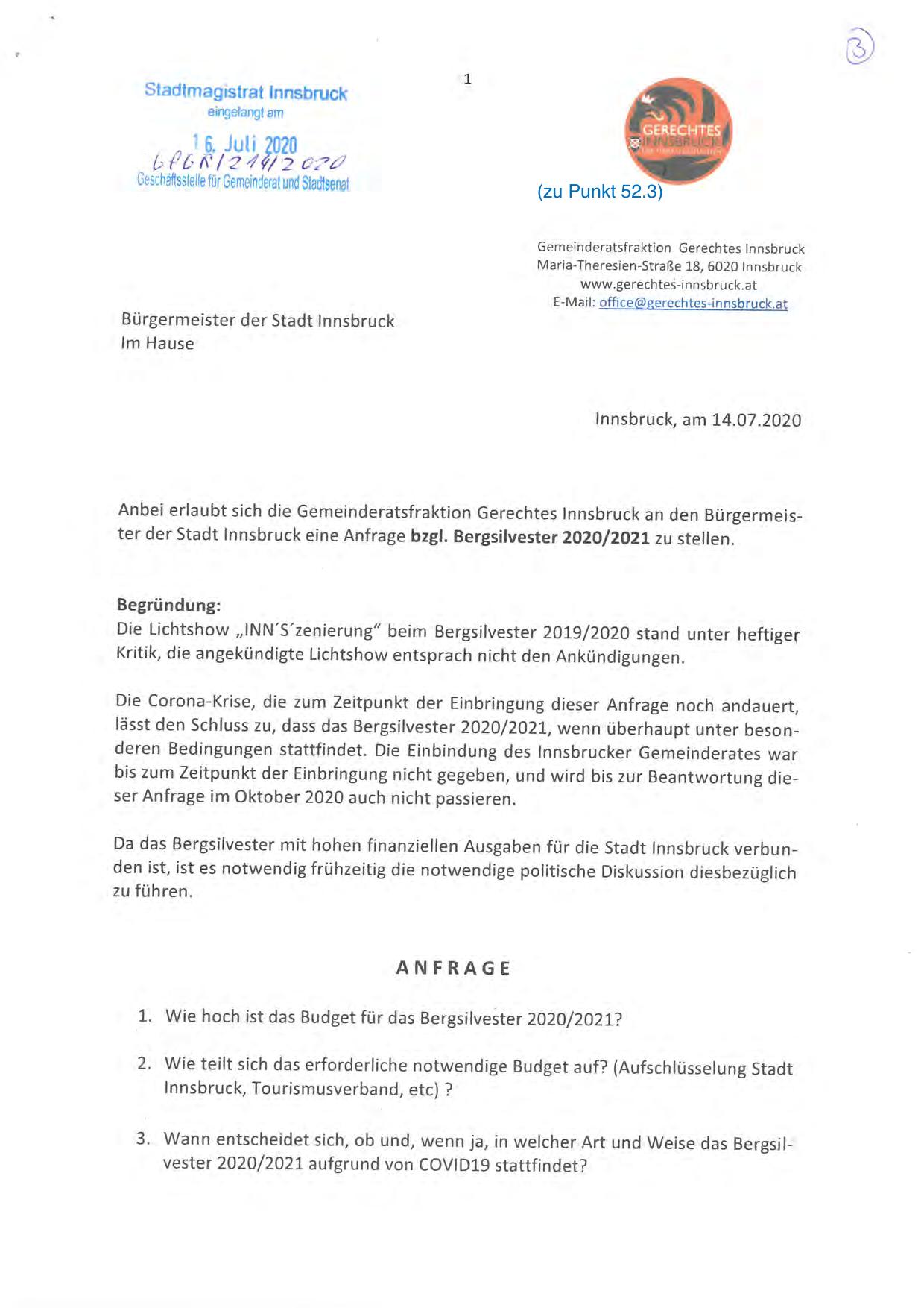 Anbei erlaubt sich die Gemeinderatsfraktion Gerechtes Innsbruck an den Bü rgermeister der Stadt Innsbruck eine Anfrage bzgl. Bergsilvester 2020/ 2021 zu stellen.
