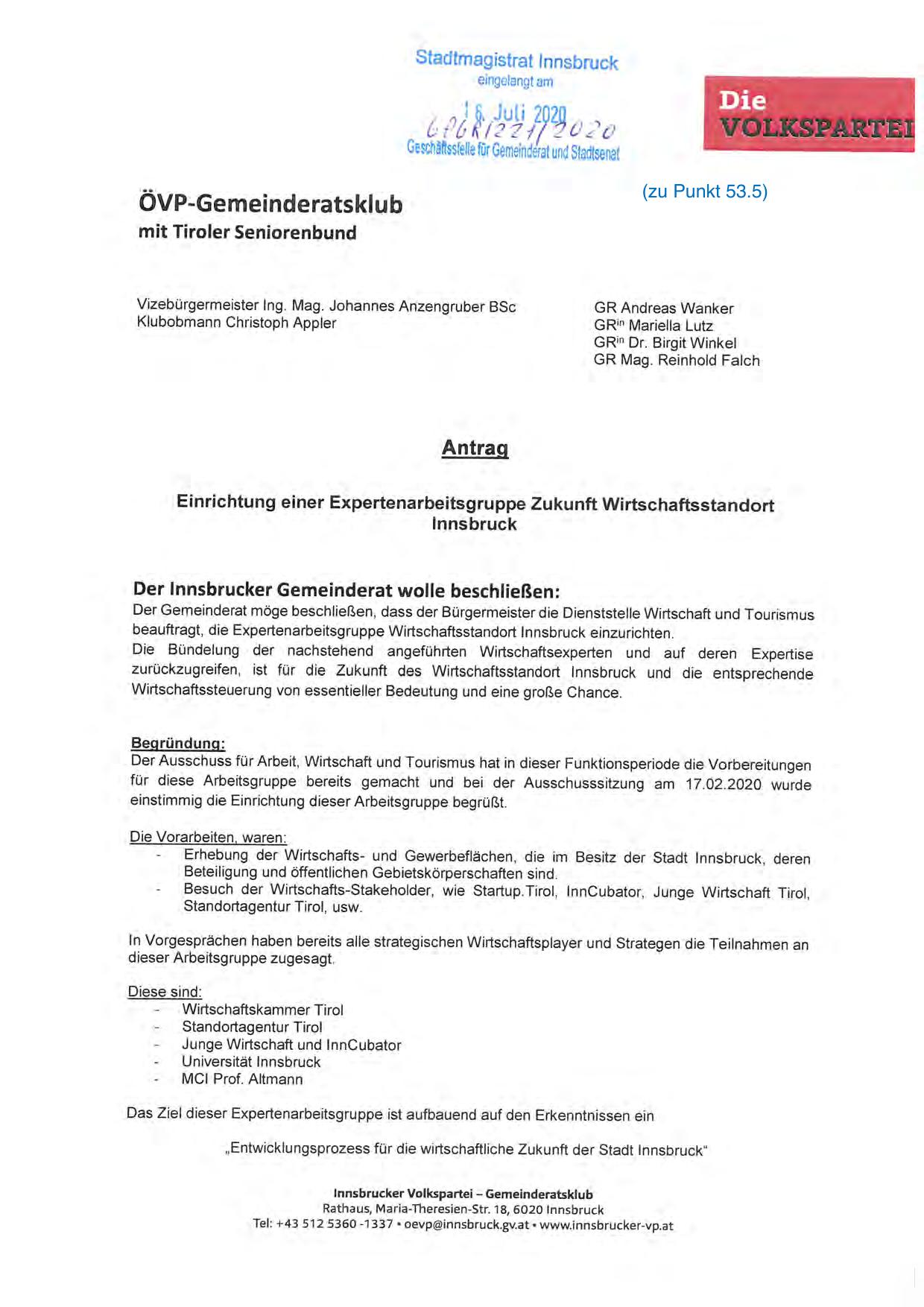 beauftragt, die Expertenarbeitsgruppe Wirtschaftsstandort Innsbruck einzurichten.