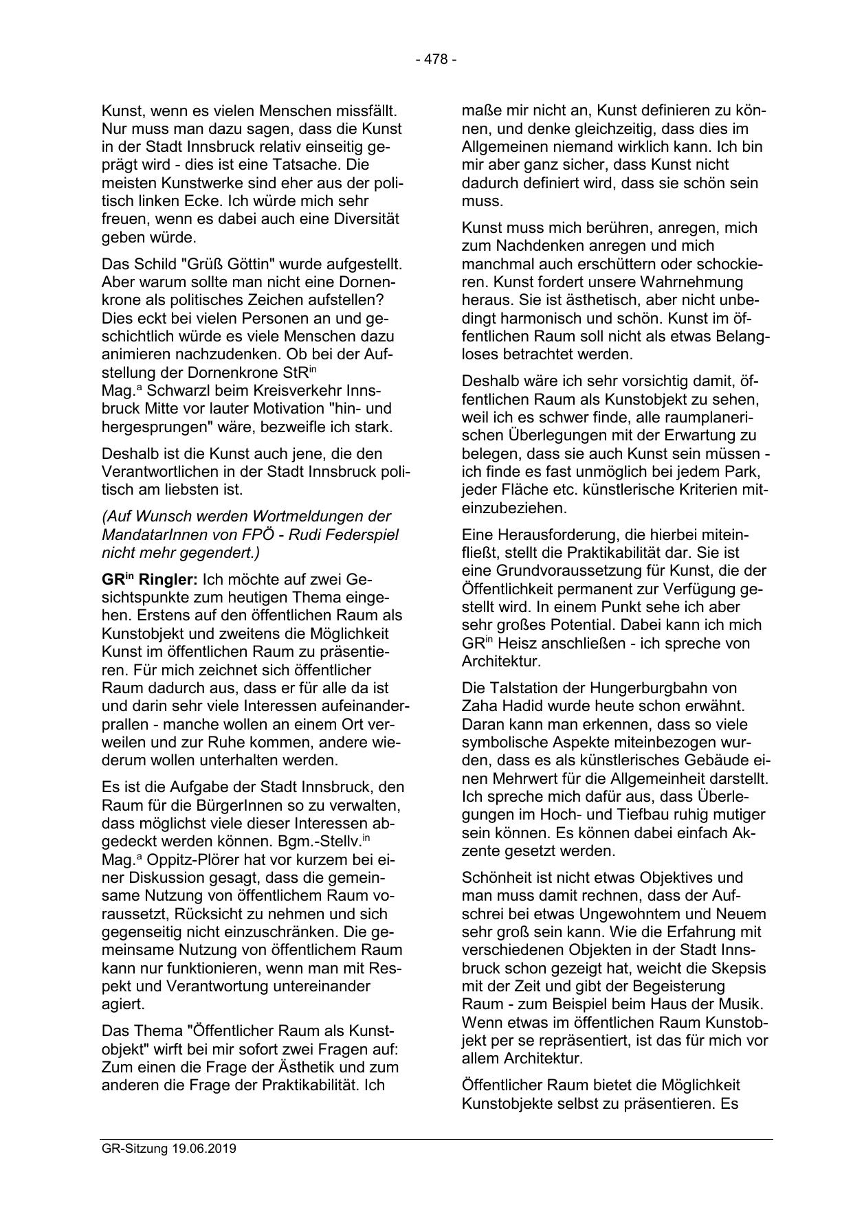 GRin Ringler: Ich möchte auf zwei Gesichtspunkte zum heutigen Thema eingehen. Erstens auf den öffentlichen Raum als
