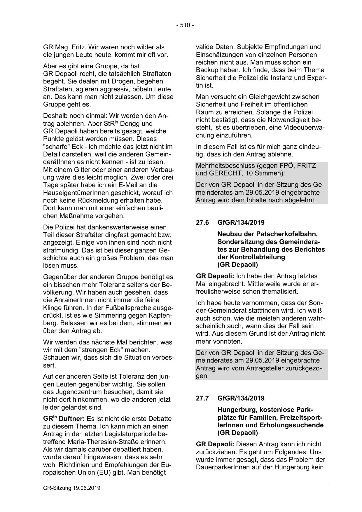 Der von GR Depaoli in der Sitzung des Gemeinderates am 29.05.2019 eingebrachte