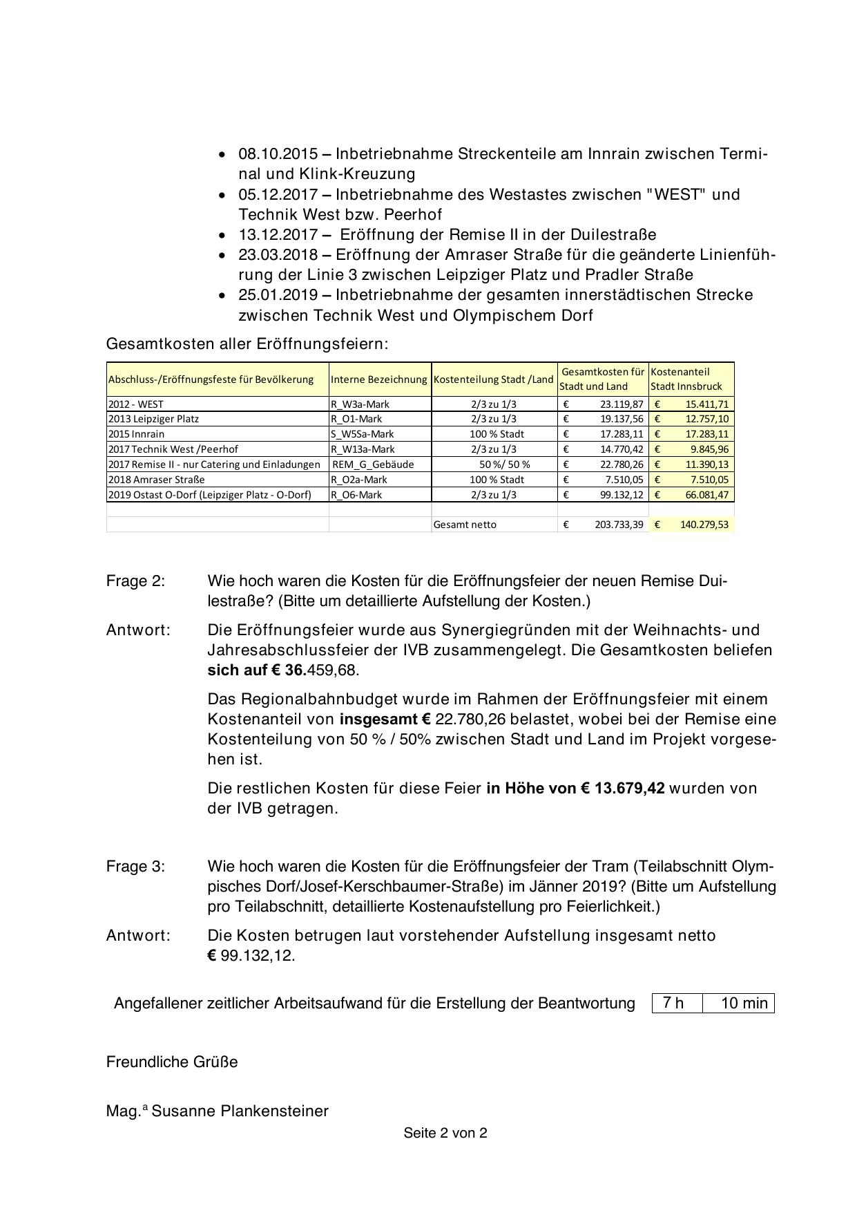 Wie hoch waren die Kosten für die Eröffnungsfeier der Tram (Teilabschnitt Olympisches Dorf/Josef-Kerschbaumer-Straße) im Jänner 2019? (Bitte um Aufstellung