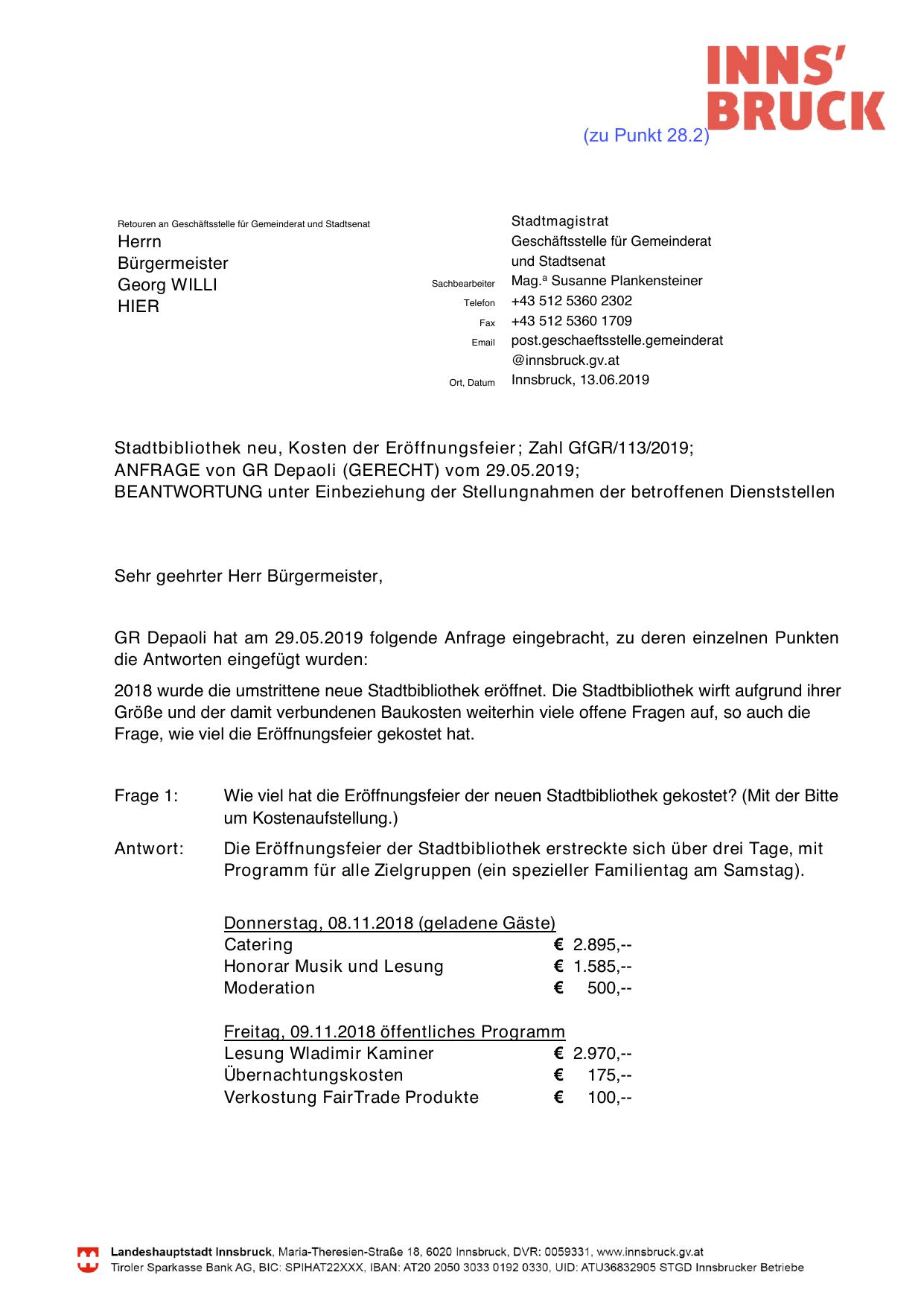 Stadtbibliothek neu, Kosten der Eröffnungsfeier; Zahl GfGR/113/2019;