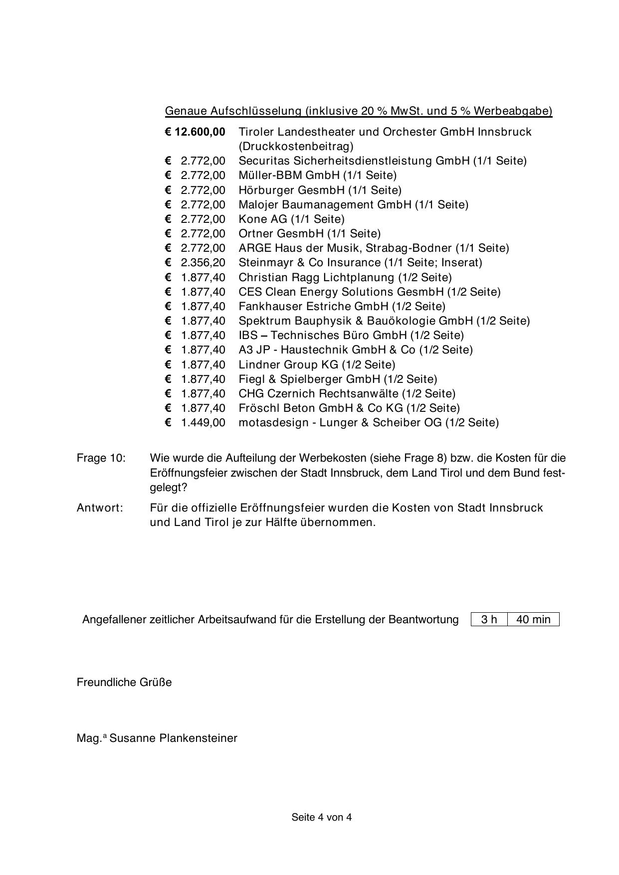 Angefallener zeitlicher Arbeitsaufwand für die Erstellung der Beantwortung