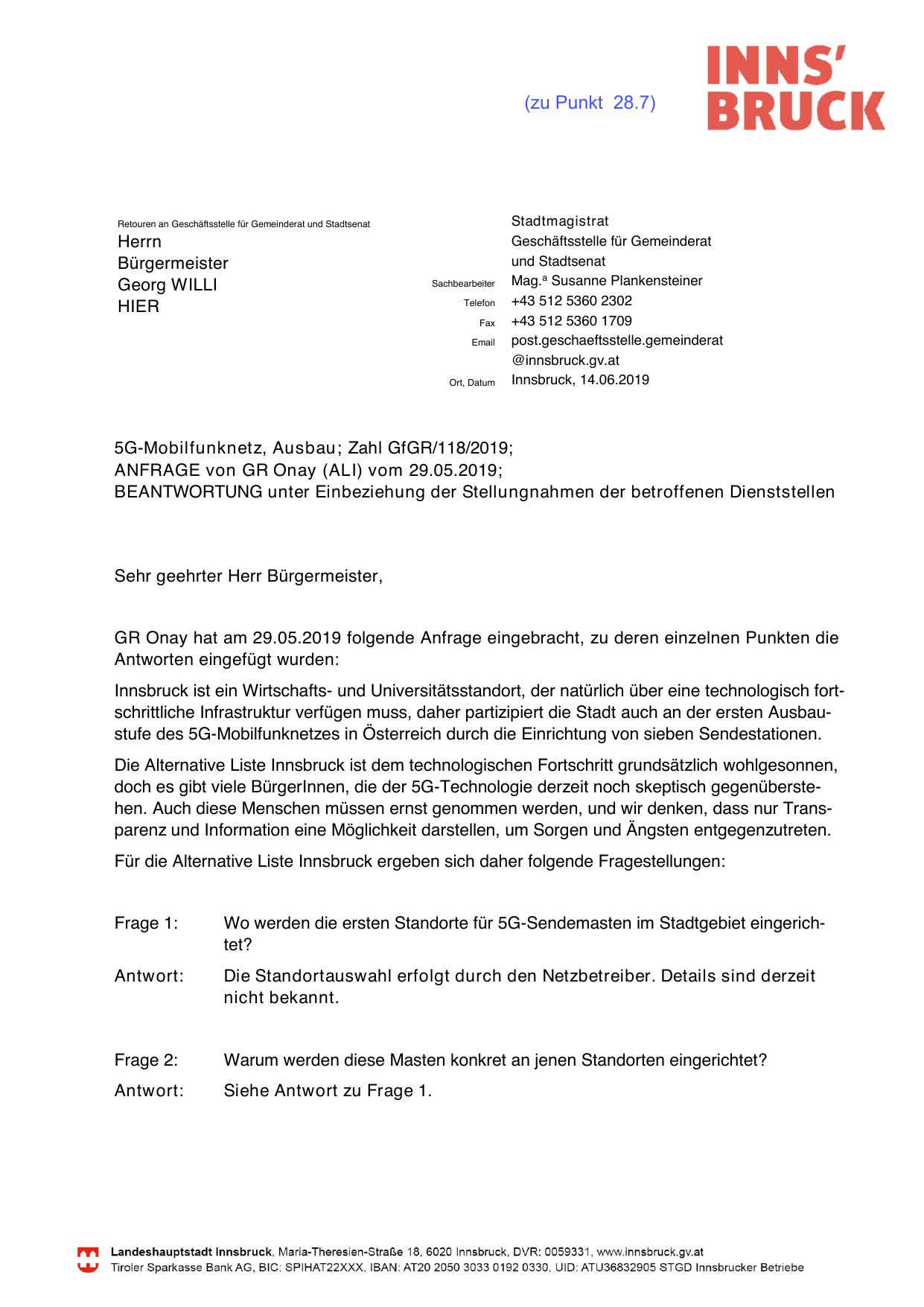 GR Onay hat am 29.05.2019 folgende Anfrage eingebracht, zu deren einzelnen Punkten die