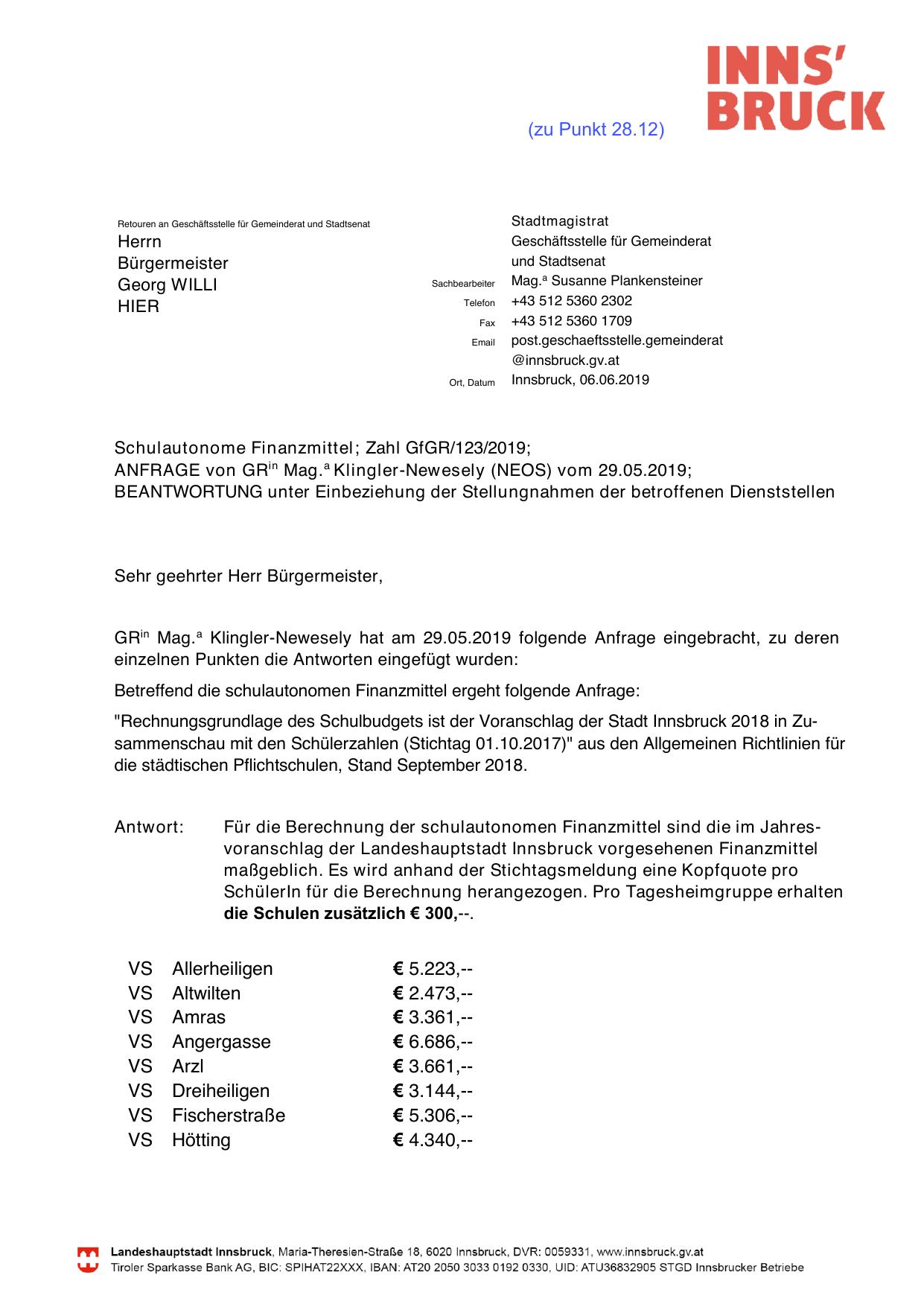 Schulautonome Finanzmittel; Zahl GfGR/123/2019;