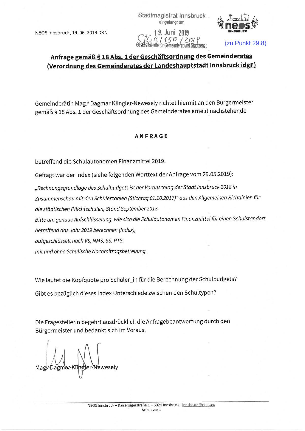 Gemeinderätin Mag.a Dagmar Klingler-Newesely richtet hiermit an den Bürgermeister