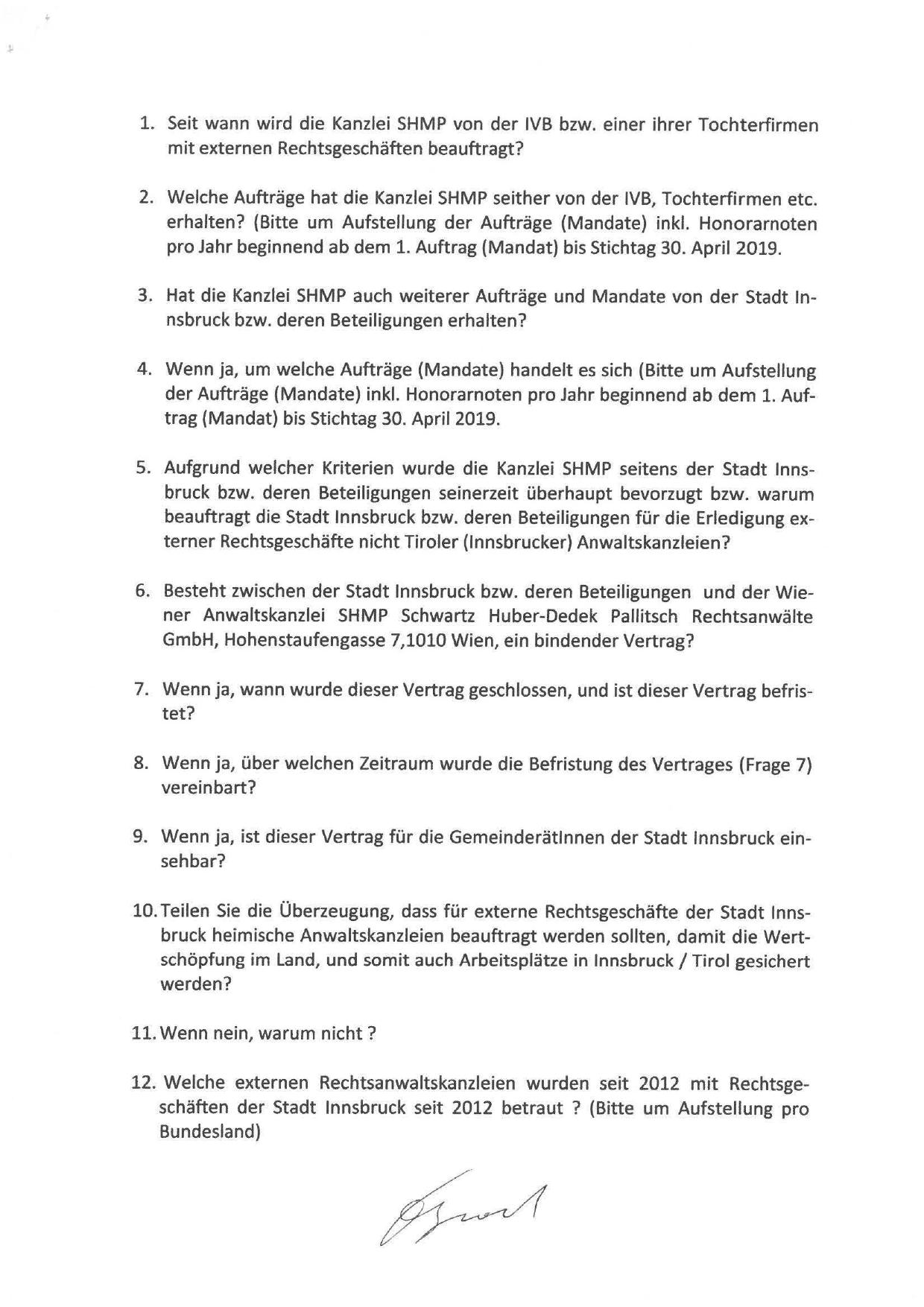 6. Besteht zwischen der Stadt Innsbruck bzw. deren Beteiligungen und der Wiener Anwaltskanzlei SHMP Schwartz Huber-Dedek Pallitsch Rechtsanwälte