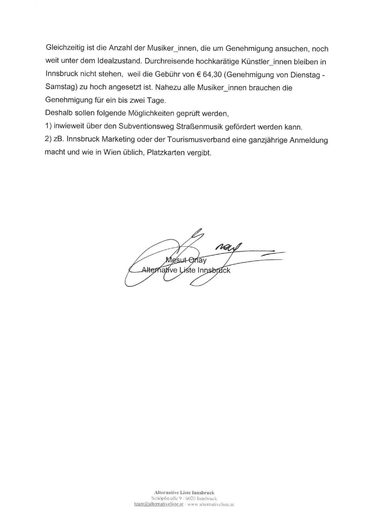 Innsbruck nicht stehen, weil die Gebühr von€ 64,30 (Genehmigung von Dienstag Samstag) zu hoch angesetzt ist. Nahezu alle Musiker_ innen brauchen die