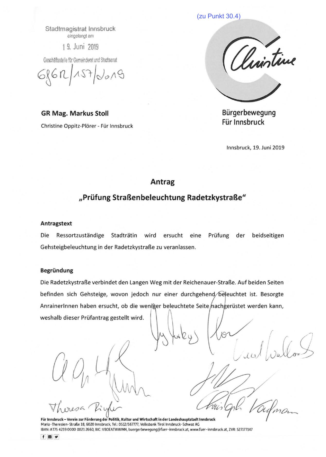 Gehsteigbeleuchtung in der Radetzkystraße zu veranlassen .