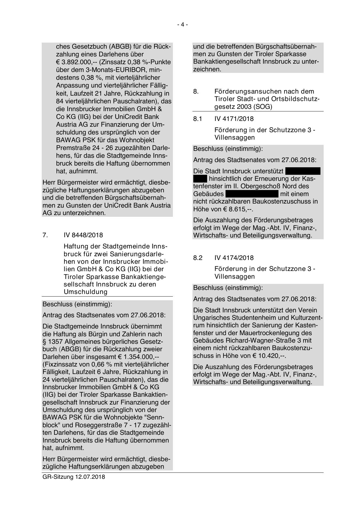 Haftung der Stadtgemeinde Innsbruck für zwei Sanierungsdarlehen von der Innsbrucker Immobilien GmbH & Co KG (IIG) bei der