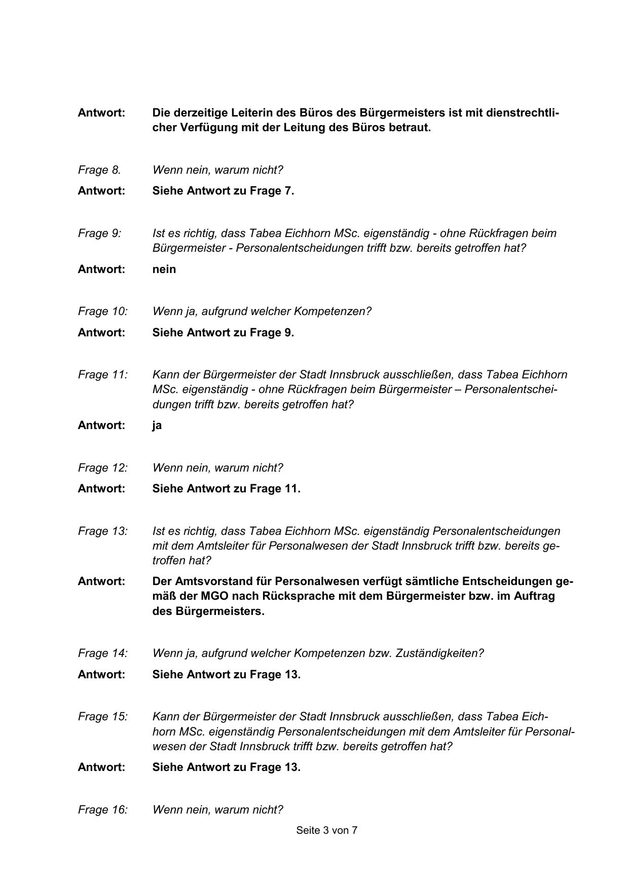 Kann der Bürgermeister der Stadt Innsbruck ausschließen, dass Tabea Eichhorn MSc. eigenständig Personalentscheidungen mit dem Amtsleiter für Personalwesen der Stadt Innsbruck trifft bzw. bereits getroffen hat?