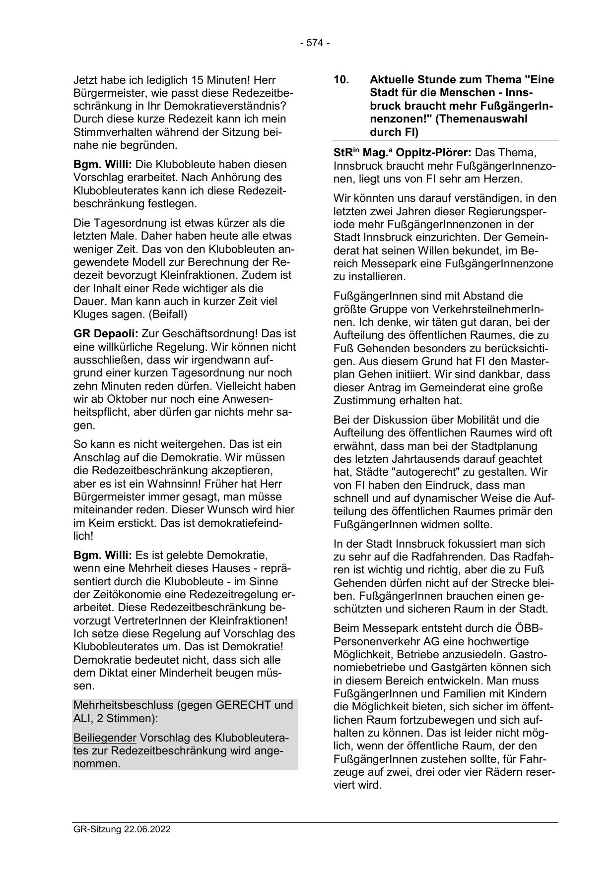 der Zeitökonomie eine Redezeitregelung erarbeitet. Diese Redezeitbeschränkung bevorzugt VertreterInnen der Kleinfraktionen!