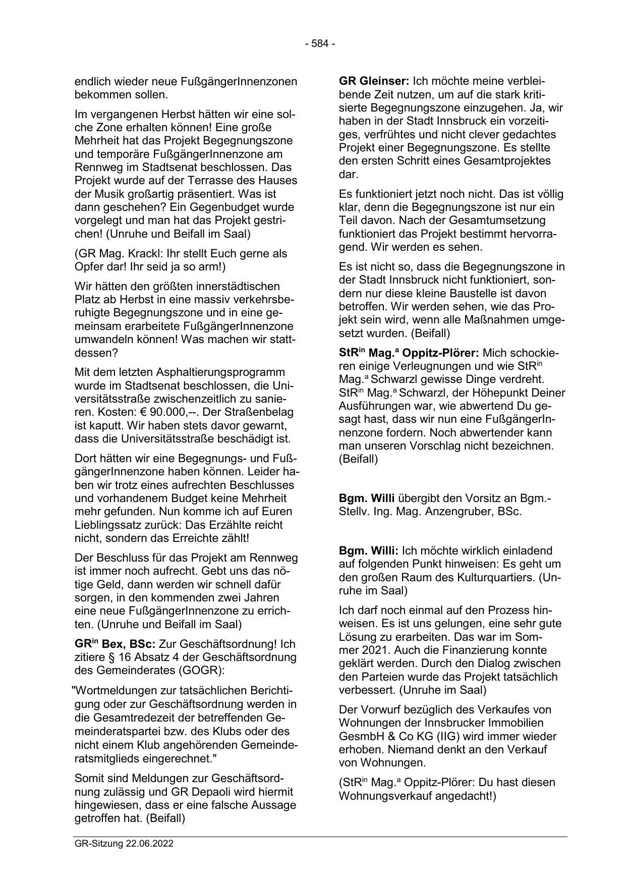 GR Gleinser: Ich möchte meine verbleibende Zeit nutzen, um auf die stark kritisierte Begegnungszone einzugehen. Ja, wir