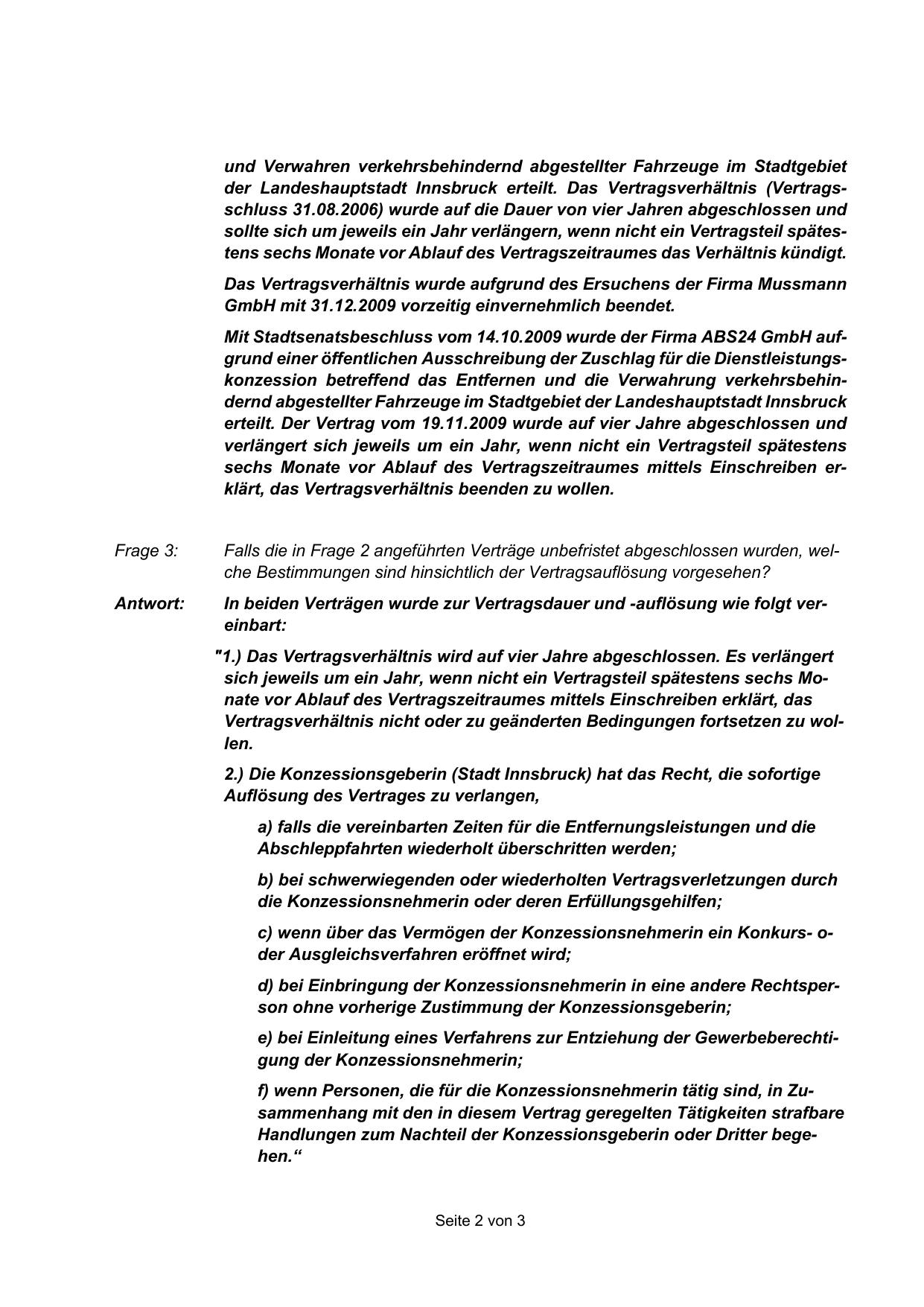 der Landeshauptstadt Innsbruck erteilt. Das Vertragsverhältnis (Vertragsschluss 31.08.2006) wurde auf die Dauer von vier Jahren abgeschlossen und