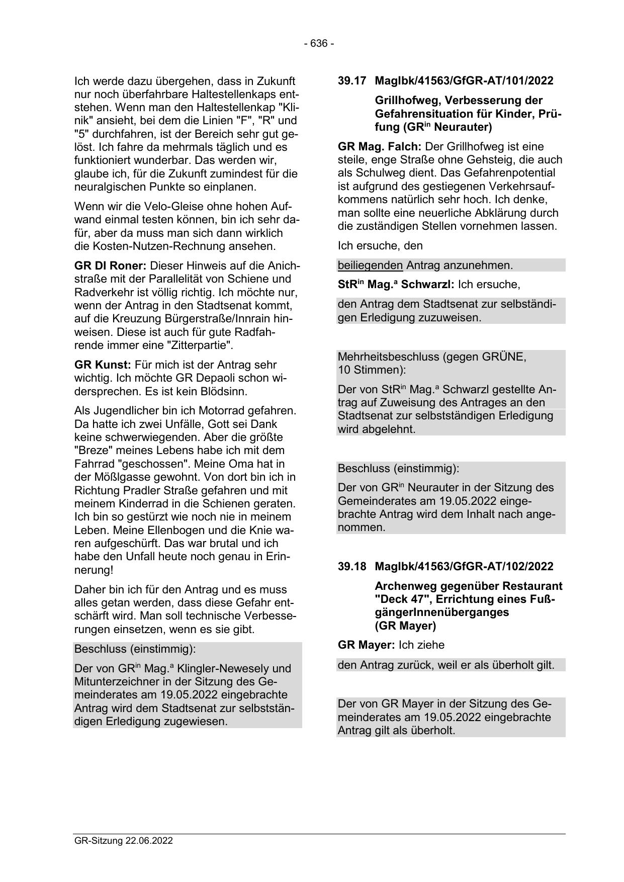 Der von GR Mayer in der Sitzung des Gemeinderates am 19.05.2022 eingebrachte