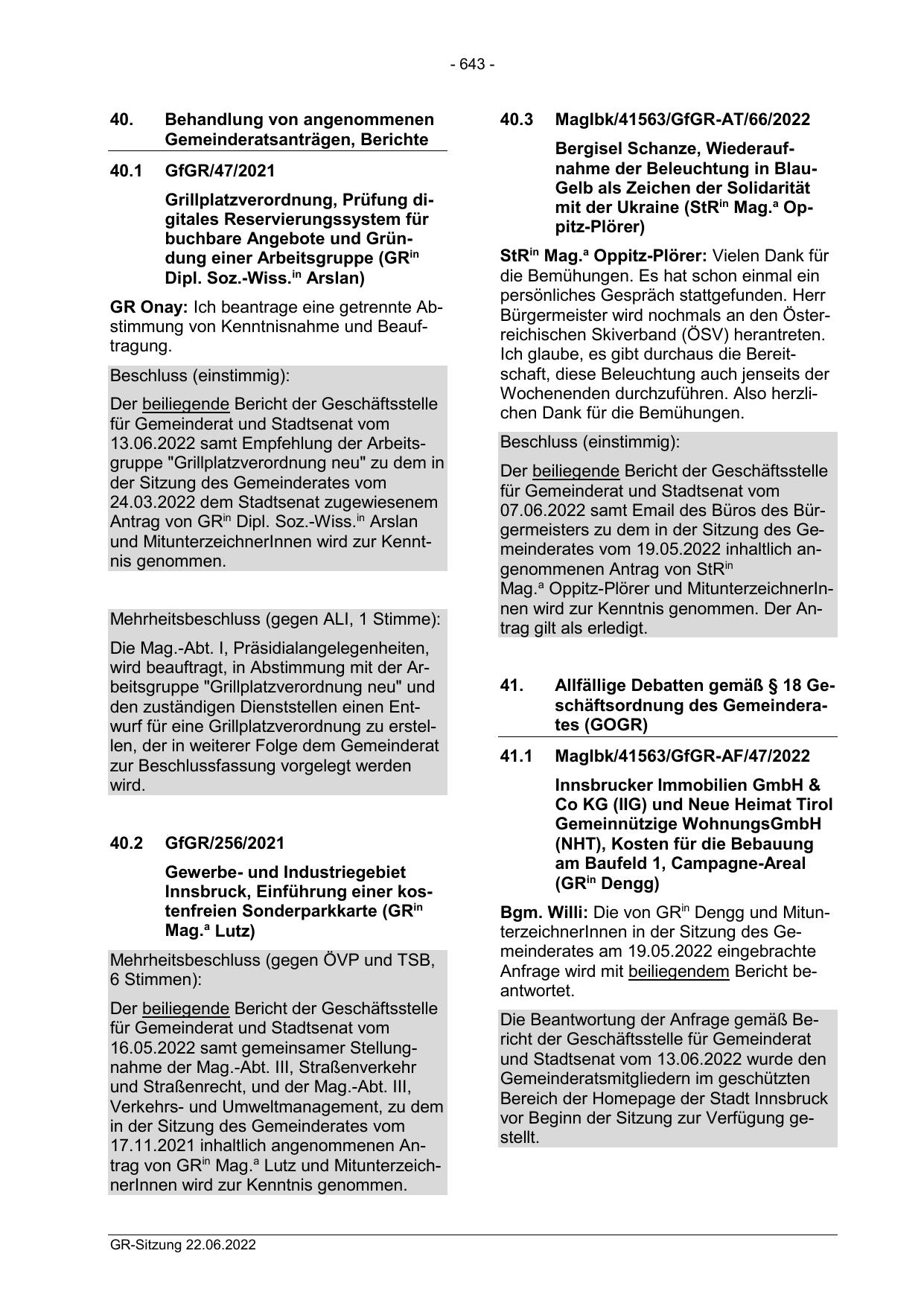Bgm. Willi: Die von GRin Dengg und MitunterzeichnerInnen in der Sitzung des Gemeinderates am 19.05.2022 eingebrachte