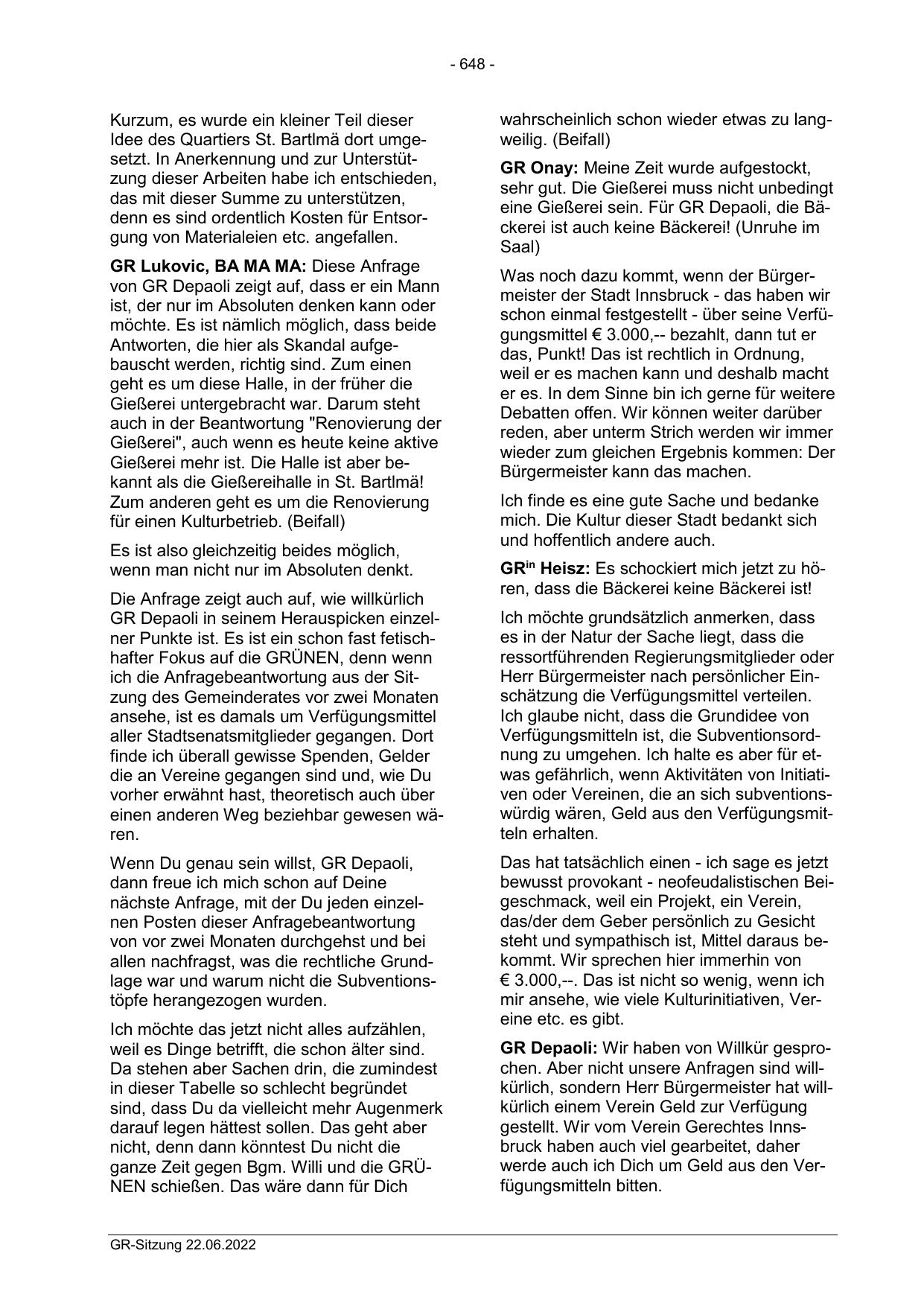 GR Depaoli: Wir haben von Willkür gesprochen. Aber nicht unsere Anfragen sind willkürlich, sondern Herr Bürgermeister hat willkürlich einem Verein Geld zur Verfügung