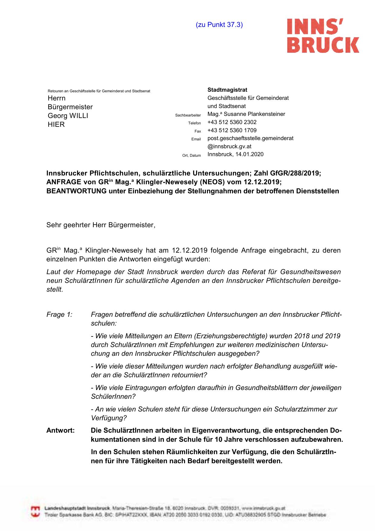 Innsbrucker Pflichtschulen, schulärztliche Untersuchungen; Zahl GfGR/288/2019;