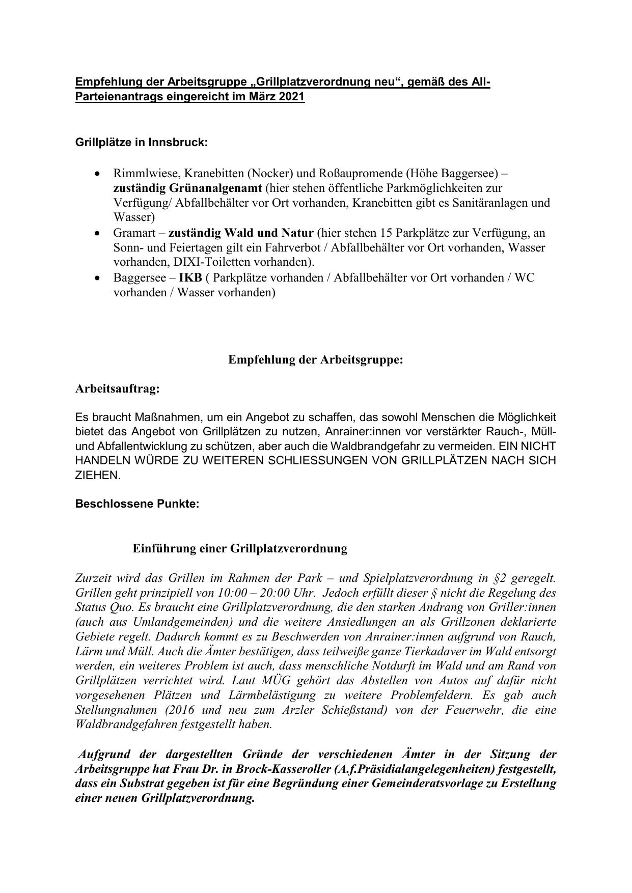 Empfehlung der Arbeitsgruppe „Grillplatzverordnung neu“, gemäß des AllParteienantrags eingereicht im März 2021
