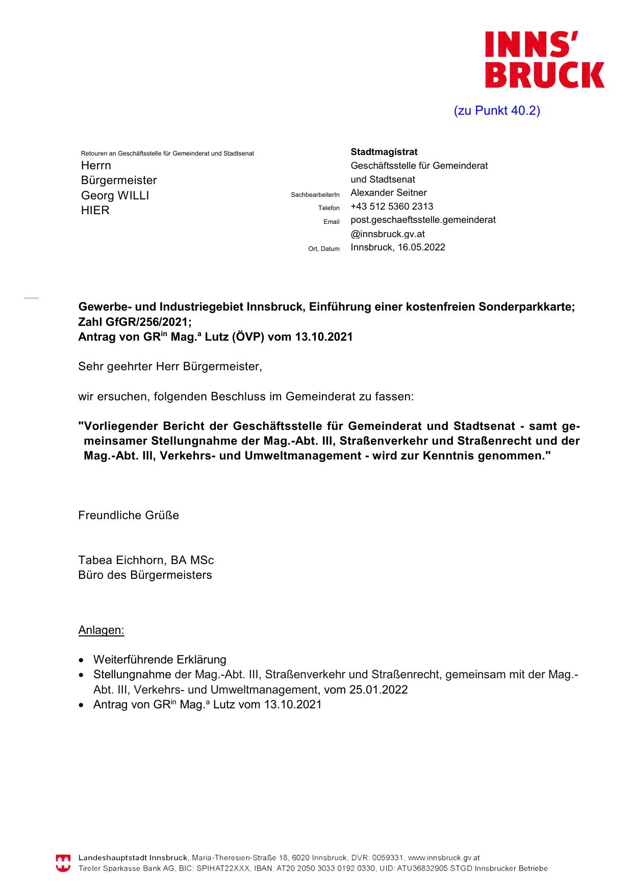 Gewerbe- und Industriegebiet Innsbruck, Einführung einer kostenfreien Sonderparkkarte;