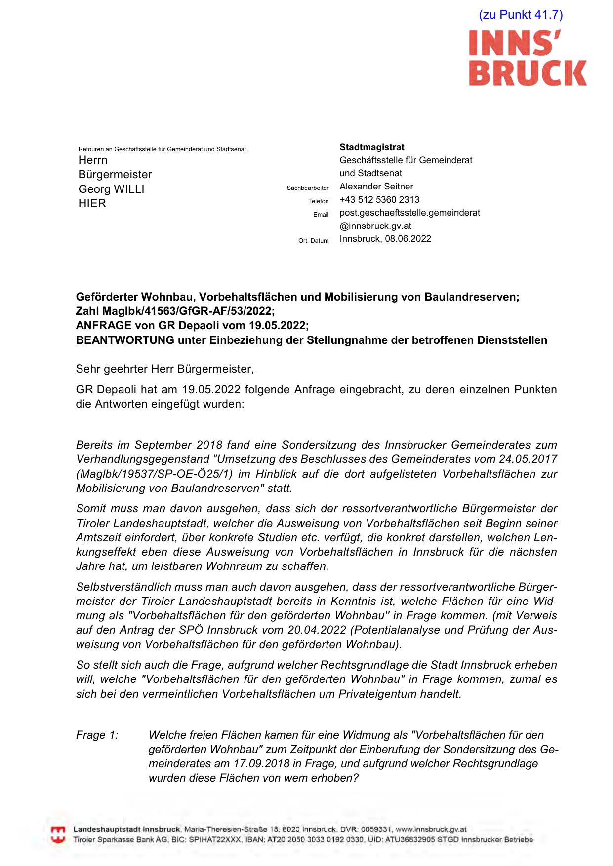 auf den Antrag der SPÖ Innsbruck vom 20.04.2022 (Potentialanalyse und Prüfung der Ausweisung von Vorbehaltsflächen für den geförderten Wohnbau).