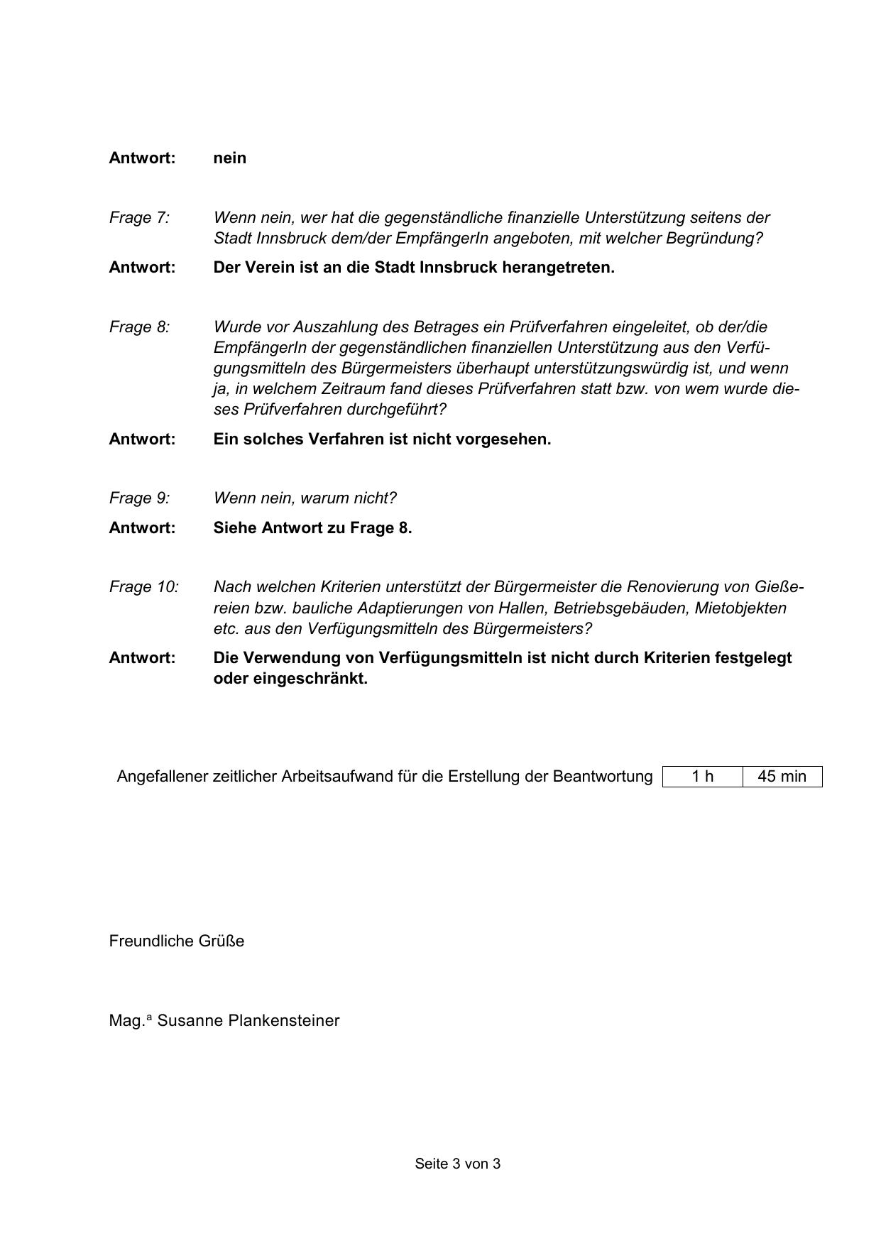 Angefallener zeitlicher Arbeitsaufwand für die Erstellung der Beantwortung