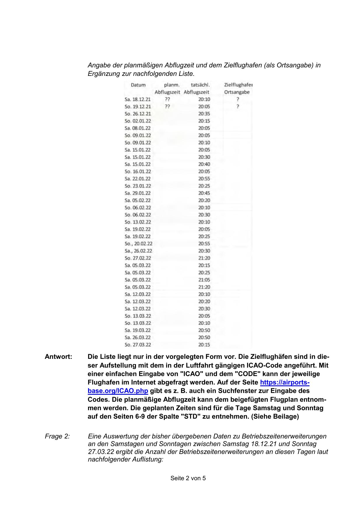 Die Liste liegt nur in der vorgelegten Form vor. Die Zielflughäfen sind in dieser Aufstellung mit dem in der Luftfahrt gängigen ICAO-Code angeführt. Mit