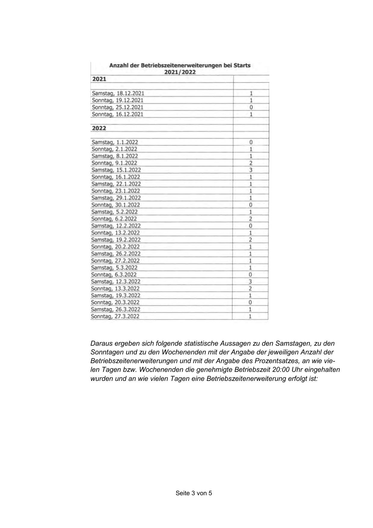 Betriebszeitenerweiterungen und mit der Angabe des Prozentsatzes, an wie vielen Tagen bzw. Wochenenden die genehmigte Betriebszeit 20:00 Uhr eingehalten